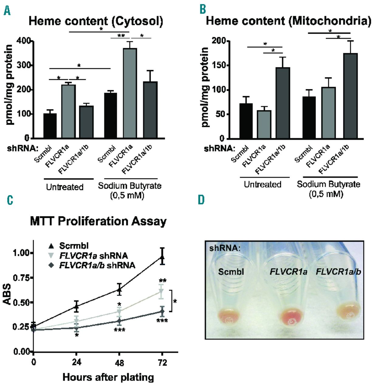 Figure 5.Silencing of FLVCR1a or FLVCR1a/1b in K562 cells differentially affects proliferation and differentiation. Heme content in the (A) cytosolic and (B) mitochondrial fractions of FLVCR1a- or FLVCR1a/1b-down-regulated K562 cells. Erythroid differentiation was induced with sodium butyrate (0.5 mM, for 72 h). Values represent mean ± SEM. *P<0.05; **P< 0.005; n=4, two-way ANOVA. (C) MTT assay on K562 cells infected with a control vector or with vectors carrying a specific shRNA for FLVCR1a or FLVCR1a/1b. Values represent mean ± SEM. *P<0.05; **P<0.005; ***P<0.001, n=3, two-way ANOVA. (D) Redness of cell pellets of control, FLVCR1a- or FLVCR1a/1b-down-regulated K562 cells.