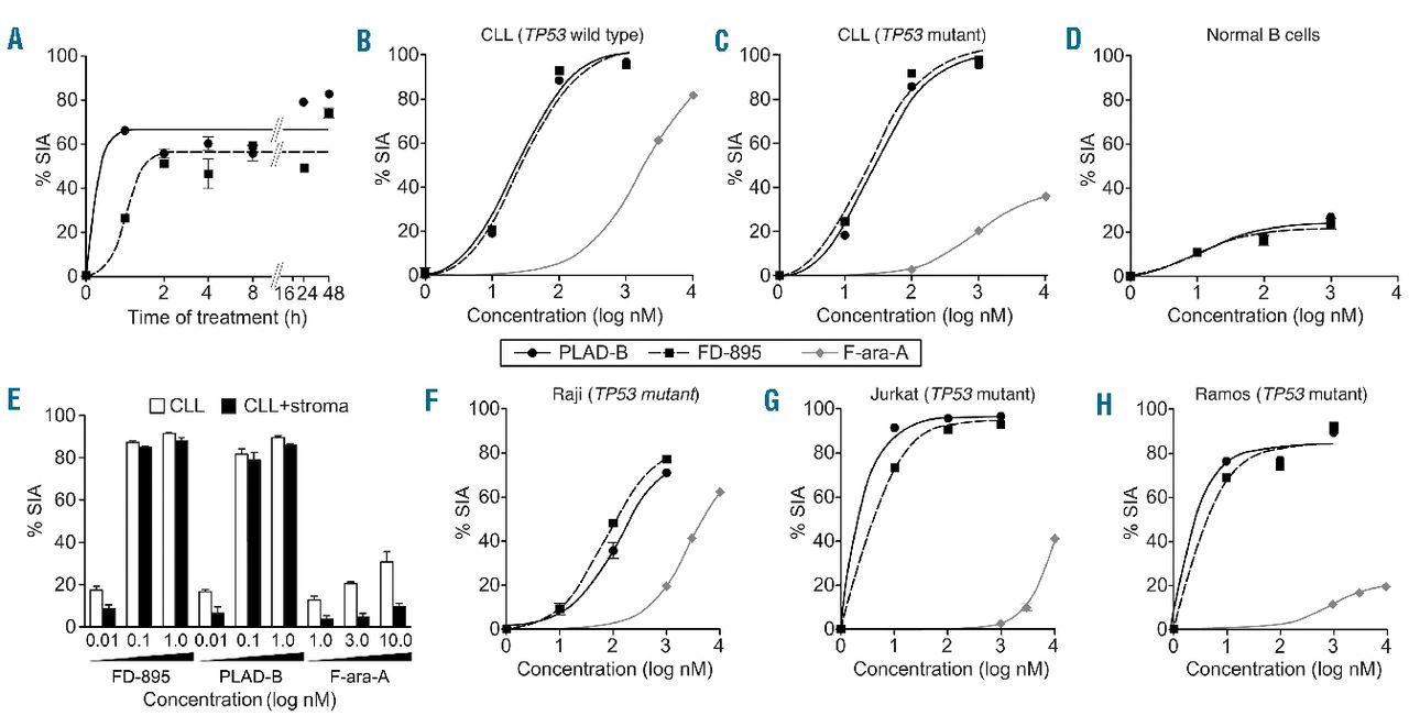Figure 4.FD-895 or PLAD-B induced apoptosis in CLL cells but not in normal lymphocytes with TP53-independent activity. (A) Primary leukemia B cells alone from a CLL patient were treated with 100 nM FD-895 or 100 nM PLAD-B at time 0 and allowed to incubate for 0.5 h, to 48 h. After initial incubations, the cells were washed twice with fresh media to remove the remaining FD-895 or PLAD-B and then were cultured using media only for a total of 48 h. The dark black line indicates FD-895 and the light color line indicates PLAD-B. Apoptosis was measured by flow cytometry using a PI/DiOC6 assay. (B–D) Cells from different sources were evaluated for their level of apoptosis after incubation with FD-895, PLAD-B or F-ara-A for 48 h, including: (B) cells from a CLL patient with wild-type TP53 and sensitive to F-ara-A; (C) cells from a CLL patient with Del(17p) and TP53 mutation (TP53-mut), resistant to F-ara-A; and, (D) normal B cells from a healthy donor. (E) Primary CLL cells derived from a Del(17p) patient were treated alone or co-cultured with stroma-NK-tert cells with FD-895, PLAD-B, or F-ara-A for 48 h. Apoptosis was measured by flow cytometry using a CD19/CD5/DiOC6 assay. (F-H) In parallel, cell lines with different TP53 mutation status were incubated with FD-895, PLAD-B or F-ara-A: (F) Raji - TP53 mutant type; (G) Jurkat cells - TP53 mutant; (H) Ramos cells - TP53 mutant. After incubation, apoptosis was assessed by flow cytometry. These results are representative of at least three separate experiments. In order to discriminate the compound specific-induced apoptosis vs. background spontaneous cell death from in vitro culture conditions, we calculated the percentage of specific induced apoptosis (% SIA) using the following formula: % SIA = [(compound induced apoptosis − media only spontaneous apoptosis) / (100− media only spontaneous apoptosis)] × 100.