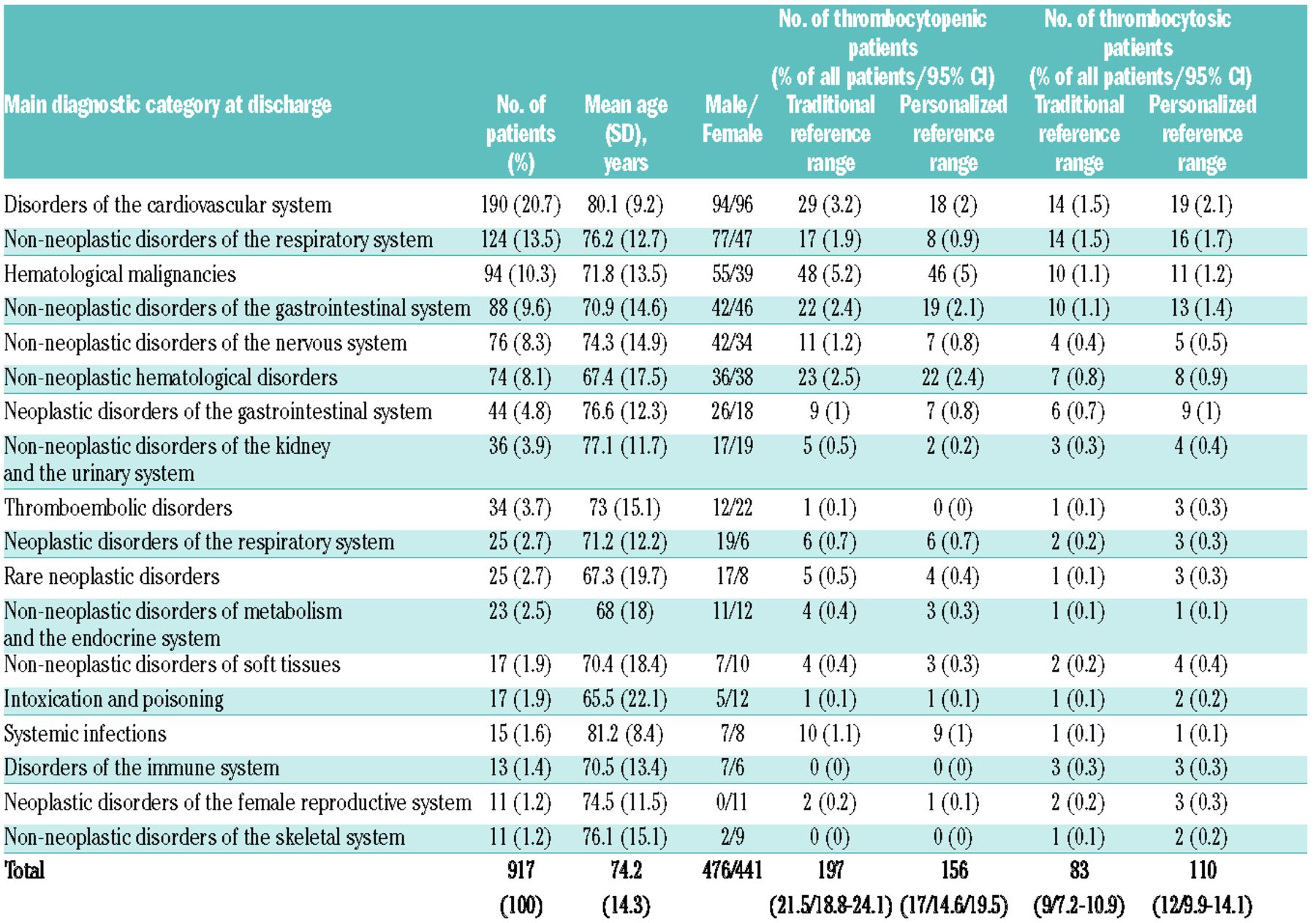 Table 1.Main characteristics and prevalence of thrombocytopenia and thrombocytosis in a series of consecutive patients admitted to the department of internal medicine.