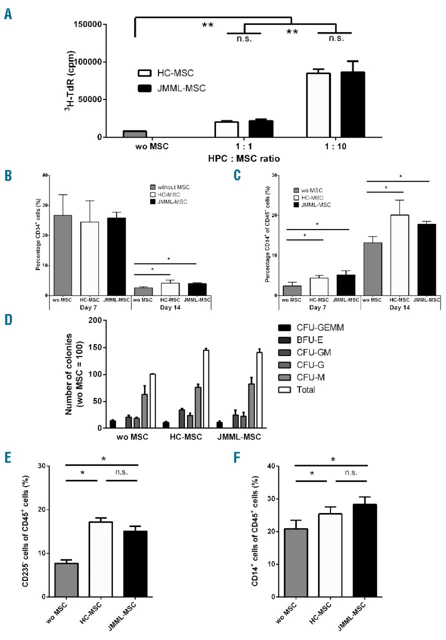 Short-term co-culture assays with MSCs and hematopoietic progenitor cells (HPC) were performed to determine the supportive capacity of MSCs for HPCs maintenance and differentiation. Therefore, HPCs were isolated from healthy transplant donors using CD34 positive selection. Proliferation (day 7) and differentiation (days 7 and 14) were assessed using H-thymidine incorporation and flow cytometry, respectively.