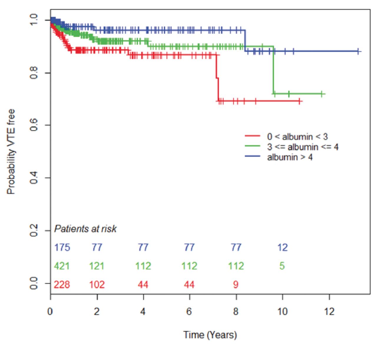 Figure 2.Kaplan-Meier estimates of VTE-free survival for individuals with serum albumin less than 3g/dL (red), greater than or equal to 3g/dL and less than or equal to 4g/dL (green), and serum albumin greater than 4 g/dL (blue).