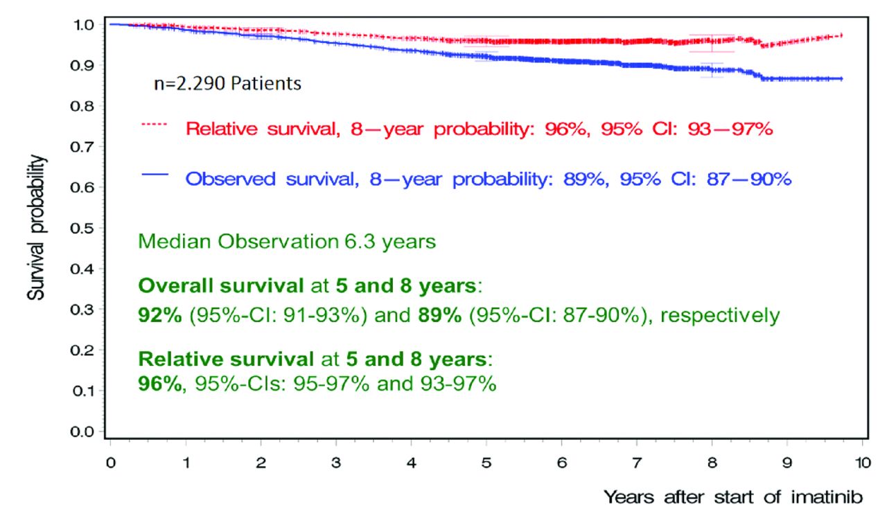 With modern drug treatment [imatinib, tyrosine kinase inhibitors (TKI)] survival with chronic myeloid leukemia (CML) has almost normalized. Results of clinical trials show that survival with CML has improved significantly over the last decades1 (Figure 1) and that life expectancy of patients with CML approaches that of the general population (Figure 2).2 Subgroups of patients, e.g. those with complete cytogenetic remission, may reach normal survival times.3