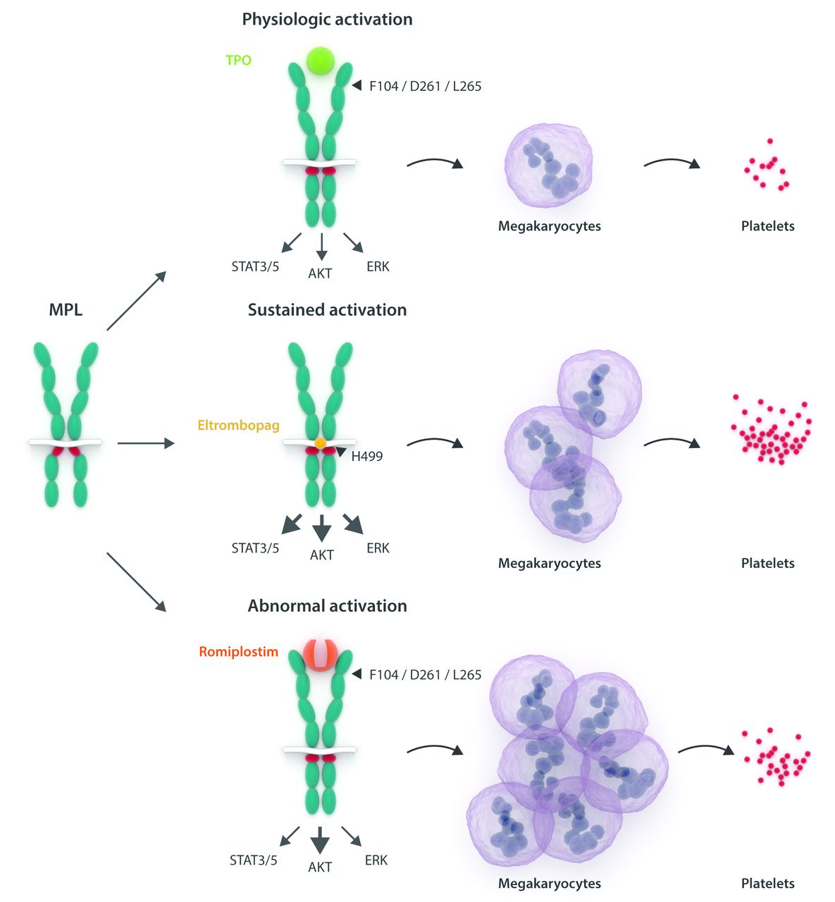 Figure 1.Different effects of eltrombopag and romiplostim compared to thrombopoietin (TPO) during megakaryopoiesis. MPL is a homodimeric receptor important for the megakaryopoiesis process. TPO binding to the extracellular domain of MPL at residues F104, D261 and L265 induces changes in MPL conformation and the activation of STAT3/5, AKT and MAPK signaling pathways. Eltrombopag is a non-peptide TPO mimetic that binds to the intracellular domain of MPL mainly at H499, and greatly enhances the STAT3/5, AKT and MAPK activation at a higher extent than TPO. This leads to megakaryocyte (MK) amplification and overproduction of platelets. Romiplostim is a peptide TPO mimetic that binds to MPL in a similar manner to TPO, but induces a strong activation of AKT compared to STAT and ERK pathways. This leads to a strong MK amplification, which produces a lower platelet yield.