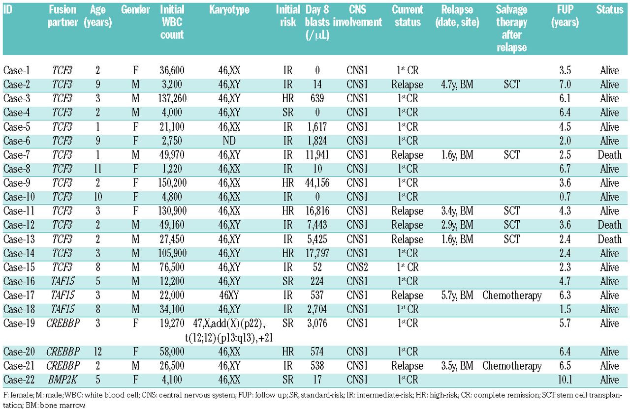 Table 1A.Clinical characteristics of acute lymphoblastic leukemia (ALL) with ZNF384-related fusion genes.
