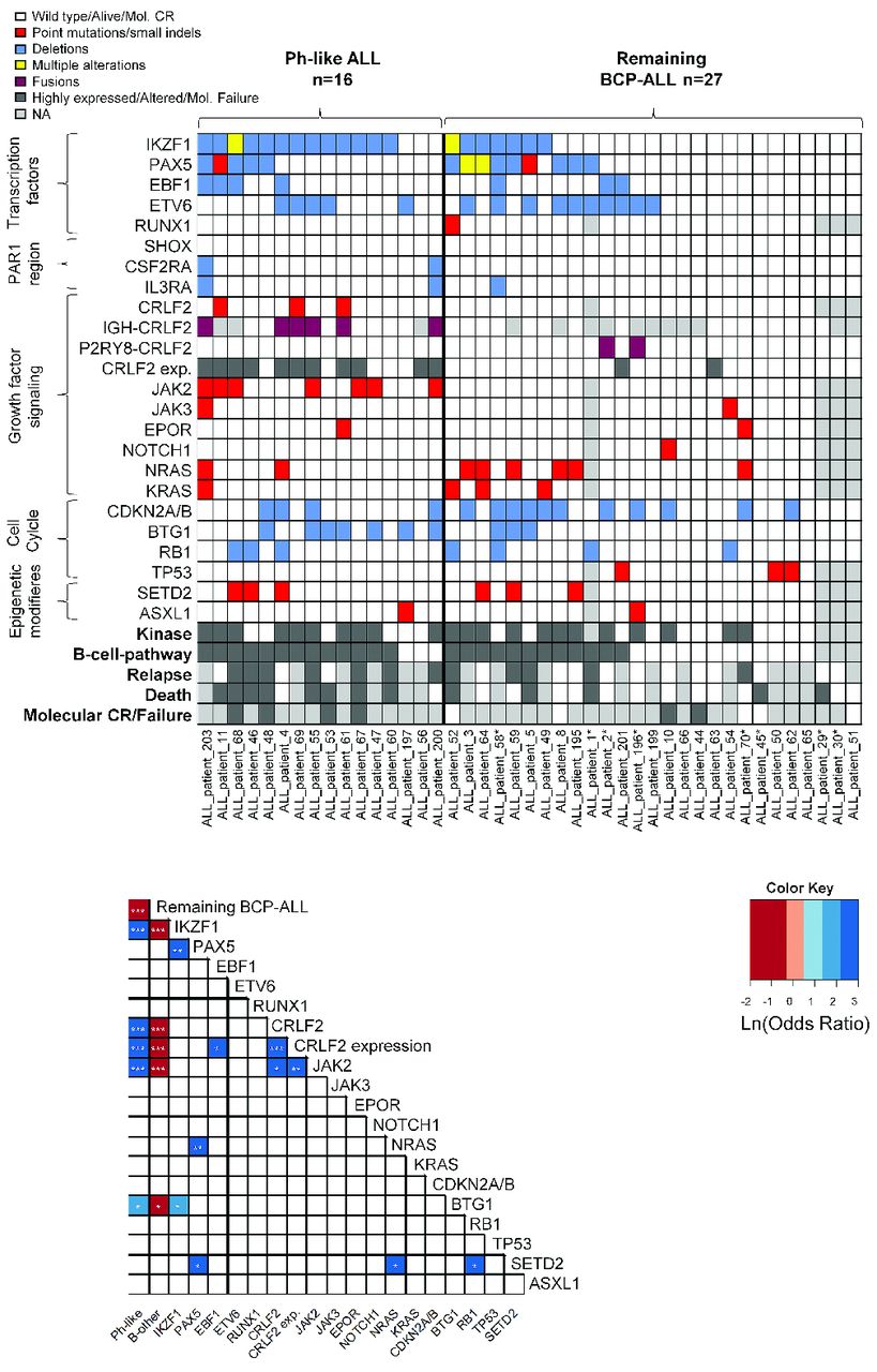 Figure 2.Distribution of genetic alterations in Ph-like and remaining BCP-ALL. (A) Panel A shows the distribution of common mutations, deletions and fusions and CRLF2 expression in Ph-like and remaining BCP-ALL (Ph-negative, MLL-t negative, non-Ph-like) patients. The definition of kinase and B-cell pathway reported by Roberts et al.5 was used. Patients represented by light gray boxes for Relapse and Death were not treated in GMALL trials 06/99 and 07/03 and no clinical data were available for them. Patients marked with “*” had either ETV6-RUNX1 or TCF3-PBX1 fusions or ALL with high hyperdiploidy. (B) Panel B shows the correlation of common mutations, deletions and fusions and CRLF2 expression in Ph-like and remaining BCP-ALL (Ph-negative, MLL-t negative, non-Ph-like).