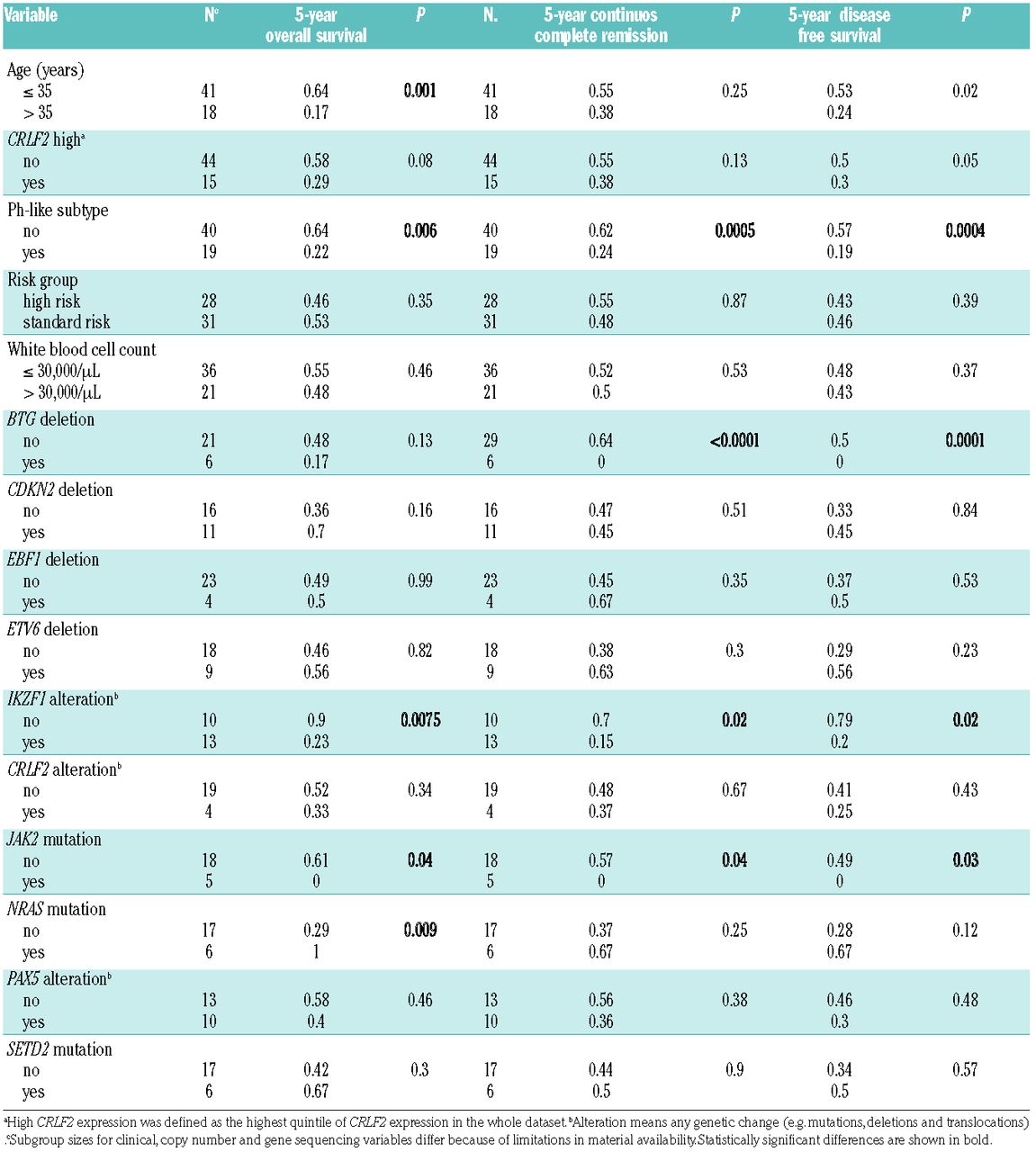 Table 3.Comparison of outcomes of the Ph-like ALL subgroup with patients classified as having B-other ALL (negative for the BCR-ABL1, MLL-t, ETV6-RUNX1 or TCF3-PBX1 fusions and hyperdiploidy or hypodiploidy).
