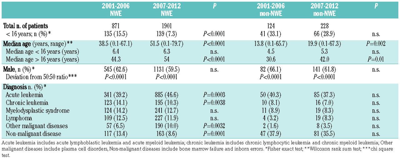 The baseline characteristics of NWE (n=2,772) and non-NWE (n=352) patients are presented in Table 1. The distribution of NWE and non-NWE patients did not differ significantly over time between the two cohorts (13% non-NWE in cohort I, and 11% non-NWE in cohort II). Data for non-NWE and mixed background patients were also analyzed separately, but showed similar outcome results and no significant differences between groups. The median age of patients increased significantly over time, mainly due to more elderly NWE patients. Non-NWE patients remained significantly younger than NWE patients in both periods (P<0·0001). Indications for transplantation changed over time. The proportion of NWE patients with chronic myeloid leukemia (P=0.0001) and inborn errors (P=0.0003) decreased while the proportion of (elderly) NWE patients with acute myeloid leukemia (P<0.0001) and plasma cell malignancies (P=0.002) increased significantly. The distribution of ethnic backgrounds of non-NWE patients in cohorts I and II was similar.