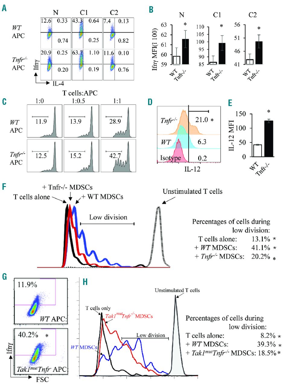Figure 4.Enhanced function of Tnfr−/− APCs and decreased function of Tnfr−/− MDSCs. (A and B) T cells from wild-type (WT) spleens were first isolated using a pan-T-cell isolation kit, then separated with anti-CD62L. Naïve T cells (CD62L+) were further cultured with WT and Tnfr−/− APCs for seven days under three conditions: 1) neutral condition (N); 2) Th1-priming condition (C1, in the presence of IL-12 and anti-IL-4); and 3) Th2-priming condition (C2, in the presence of IL-4 and anti-IL-12). Cells were collected and subjected to intracellular staining for cytokines (A). The mean fluorescence intensity (MFI) of Ifnγ in all of the groups was calculated and is presented in bar graphs (B). (C–E) CFSE-labeled WT T cells were co-cultured with either WT or Tnfr−/− APCs in the presence of anti-CD3 and anti-CD28. After three days of culturing, cells were collected and analyzed for the percentage of T cells with more than 3 divisions (C). WT and Tnfr−/− APCs were stained for intracellular IL-12 (D). MFI of IL-12 in the two groups in (D) was calculated and presented in bar graphs (E). (F) CD11b+Gr1+ cells were sorted from WT and Tnfr−/− bone marrow and added to anti-CD3-activated, CFSE-labeled WT T cells at a ratio of T:MDSC=1:2 and co-cultured for six days. The CFSE signals were analyzed on day 6. The results were analyzed to show the cells with a low number of divisions (2–6 divisions). (G) T cells from WT spleens were isolated using a pan-T-cell isolation kit and were cultured with WT and Tak1mutTnfr−/− APCs for seven days under Th1-priming condition. Cells were collected and subjected to intracellular staining for Ifnγ. (I) CD11b+Gr1+ cells were sorted from WT and Tak1mutTnfr−/− BM, added to anti-CD3-activated, CFSE-labeled WT T cells at a ratio of T:MDSC=1:2 and co-cultured for six days. The CFSE signals were analyzed on day 6. The results were analyzed to show the cells with a low number of divisions. The samples were analyzed in triplicate and experiments were repeated independently twice. *P<0.05 compared to WT.