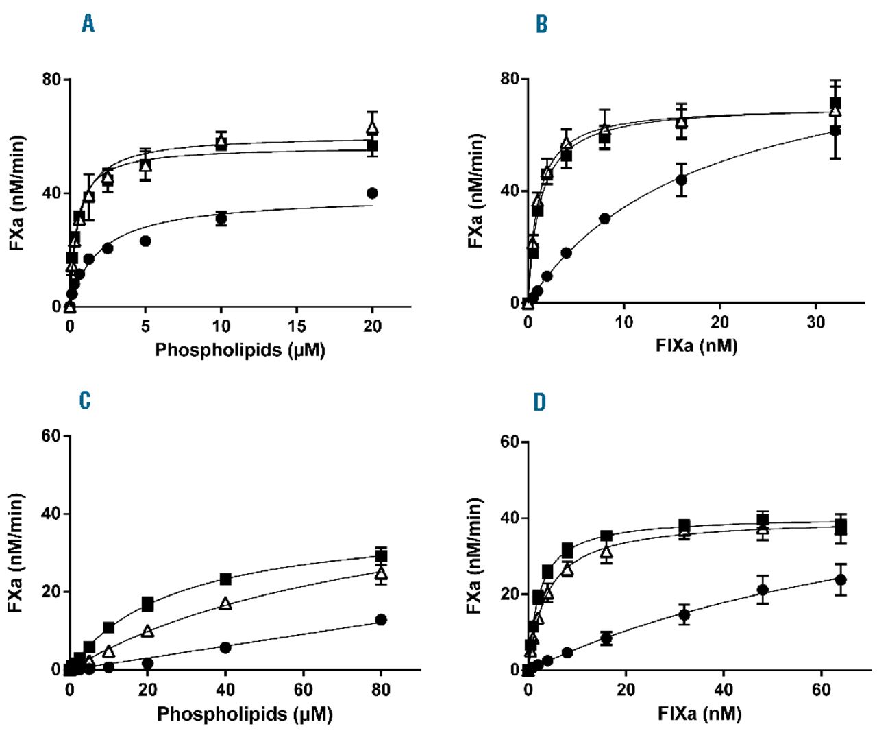 Figure 4.FVIII cofactor activity of the FVIII-YFP chimeras. FVIII-YFP (closed squares), FVIII-YFP/FV-C1 (closed circles) and FVIII-YFP/FV-C2 (open triangles) were examined for their capability to function as cofactor in the activation of FX. FX activation studies were performed in the presence of phospholipid vesicles containing 15% phosphatidylserine, 20% phosphatidylethanolamine, and 65% phosphatidylcholine (panels A and B) or 5% phosphatidylserine, 20% phosphatidylethanolamine, and 75% phosphatidylcholine panels (C and D) in a buffer containing 40 mM Tris-HCl (pH 7.8), 150 mM NaCl and 0.2% (w/v) bovine serum albumin. FIXa titrations (panels B and D) were performed by incubation of 25 μM of phospholipid vesicles mixed with 0–64 nM FIXa, 0.3 nM FVIII and 200 nM FX. Phospholipid titrations (panels A and C) were performed by incubation of 0–80 μM phospholipid vesicles mixed with 16 nM FIXa, 0.3 nM FVIII and 200 nM FX. Reactions were initiated by addition of 1.5 mM CaCl2 and 1 nM thrombin. Subsamples of the reaction mixture were taken at 30 s intervals and analyzed for FXa using the substrate S-2765 containing the thrombin inhibitor I-2581.21 Absorbance values were converted into molar concentrations using a standard curve of active-site titrated purified FXa.