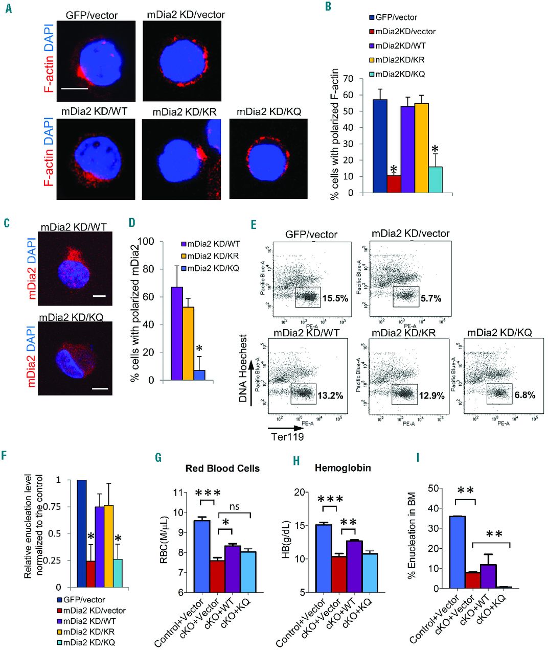 In order to determine whether deacetylation of mDia2 is required for CAR formation, we simultaneously knocked down mDia2 with shRNA (Online Supplementary Figure S5A,B) and re-expressed shRNA resistant mDia2 WT, non-acetyl-mimicking mDia2 K970R, or acetyl-mimicking mDia2 K970Q (Online Supplementary Figure S5C). The WT and K970R mutant, but not the K970Q mutant, rescued the defective F-actin polarization phenotype in mDia2 knockdown cells (Figure 6A,B). The K970Q mutant also failed to rescue the mDia2 polarization phenotype (Figure 6C,D). Importantly, WT or K970R rescued the enucleation in mDia2 knockdown cells (Figure 6E,F). As expected, the mDia2 K970Q mutant was not able to rescue the defects of enucleation in mDia2 knockdown cells (Figure 6E,F). To test whether this is also the case in vivo, bone marrow cells from mDia2 knockout mice were infected with retrovirus encoding WT mDia2 or K970Q mutant. Infected bone marrow cells were transplanted into lethally irradiated recipient mice and bone marrow was collected 1 month later. The mice with mDia2 knockout had low red blood counts and low hemoglobin levels. This phenotype was not rescued in mice transplanted with K970Q bone marrow, while it was partially rescued in those transfected with WT mDia2 (Figure 6G,H). Importantly, the number of enucleated red cells in bone marrow was significantly reduced in K970Q-rescued mice (Figure 6I). The more severe effect of K970Q in bone marrow than in the in vitro assay may be due to the fact that K970Q affects both cytokinesis and enucleation in bone marrow. We, thus, demonstrated that deacetylation of mDia2 is required for terminal erythropoiesis in vitro and in vivo.