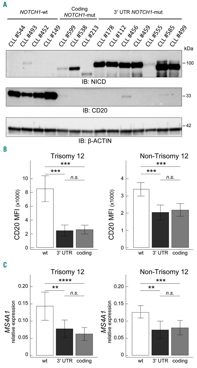 Figure 1.Correlation between 3′ UTR NOTCH1 mutations and CD20 expression. (A) Western blot showing NICD (upper panel) and CD20 (L26 epitope, with short exposure, lower panel) protein expression in representative CLL cases, i.e. four NOTCH1-wt cases, three coding NOTCH1-mut cases (2 cases with the g.139390648CAG>C, c.7541-7542delCT, p.P2514Rfs*4; 1 case with the g.139390929AC>A, c.7261delG, p.V2421*), and seven 3′ UTR NOTCH1-mut cases (5 cases with the g.139390152T>C, c.*7668+371A>G; 2 cases with the g.139390145T>C, c.*7668+378A>G). β-actin was used as loading control. Identification (ID) number according to Online Supplementary Table S1 is also reported. (B) Bar graphs showing CD20 protein expression levels evaluated by flow cytometry in 112 trisomy 12 CLL cases (9 3′ UTR NOTCH1-mut cases, 35 coding NOTCH1-mut cases, 68 NOTCH1-wt cases) and 550 non-trisomy 12 CLL cases (17 3′ UTR NOTCH1-mut cases, 55 coding NOTCH1-mut cases, 478 NOTCH1-wt cases). Data were analyzed using the t test. *: P<0.05; **, P<0.01; ***, P<0.001; n.s.= not significant. Bar graphs represent mean values, error bars represent the 95% confidence interval (CI). Abbreviations: NOTCH1-wt: wt; 3′ UTR NOTCH1-mut: 3′ UTR; coding NOTCH1-mut: coding. (C) Bar graphs showing MS4A1 transcript expression levels, as evaluated by quantitative real-time polymerase chain reaction, in 662 CLL cases subdivided according to NOTCH1 mutational status as reported in (B). Data were analyzed using the t test. *P<0.05; **P<0.01; ***P<0.001; n.s.= not significant. Bar graphs represent mean values, error bars represent the 95% confidence interval. NOTCH1-wt: wt; 3′ UTR NOTCH1-mut: 3′ UTR; coding NOTCH1-mut: coding.