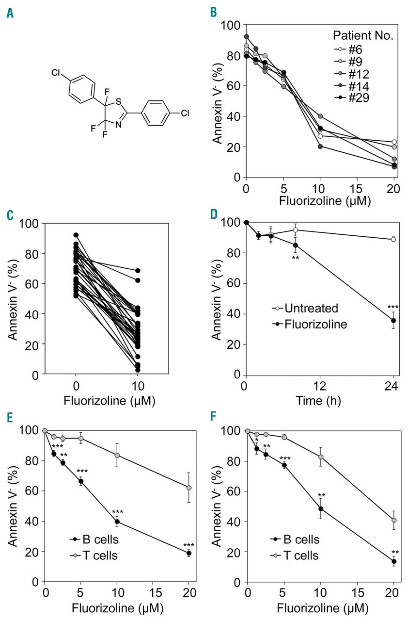 Figure 1.Cytotoxicity of fluorizoline in CLL cells ex vivo. (A) Chemical structure of fluorizoline. (B) Dose response of fluorizoline on primary CLL cells. PBMNC from 5 representative untreated CLL patients (#6, 9, 12, 14 and 29) out of 34 were incubated for 24 h with increasing doses of fluorizoline ranging from 1.25 to 10 μM. (C) PBMNC from 34 CLL patients were incubated for 24 h with or without 10 μM fluorizoline. (D) Time course of fluorizoline-induced apoptosis in CLL cells. Cells from 5 patients were untreated or incubated for different times ranging from 2 to 24 h with 10 μM fluorizoline. (E) Dose response of the cytotoxic effect of fluorizoline on B and T cells from CLL patients. PBMNC from CLL patients were incubated for 24 h with increasing doses of fluorizoline ranging from 1.25 to 10 μM. Viability was measured on CD3+ (T cells, n=15) and CD19+ (B cells, n=34) populations. (F) Dose response of the cytotoxic effect of fluorizoline on normal B and T cells. PBMNC from 12 healthy donors were incubated for 24 h with increasing doses of fluorizoline ranging from 1.25 to 10 μM. Viability was measured on CD3+ (T cells) and CD19+ (B cells) populations. (B, C, D, E and F) Viability (annexin V negative) was measured by analysis of phosphatidylserine exposure in total population or in CD19+ and CD3+ populations and is expressed (B and C) as the percentage of non-apoptotic cells or (D, E and F) as the percentage of the viability of untreated cells. (D, E and F) Data are shown as the mean±SEM. (D) Two-tailed paired Student’s t-test was performed. (E and F) Two-tailed unpaired Student’s t-test was performed. Significant P values are indicated: *P<0.05; **P<0.01; ***P<0.001 treated versus untreated cells or CD19+ versus CD3+ cells.