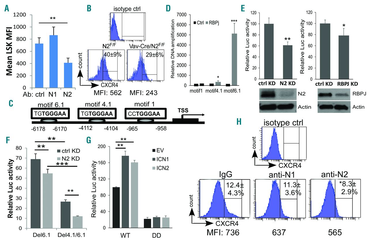 Figure 7.Notch2 signaling regulates hematopoietic stem cell and progenitor (HSPC) CXCR4 expression. (A and B) Cell surface expression of CXCR4 in mean fluorescence intensity (MFI) was assessed by FACS analysis of bone marrow LSK cells from mice receiving 4 doses of control (ctrl) or Notch1/2 blocking antibody (n=5/each group) (A), or from Vav-Cre/Notch2F/F mice and control mice (Vav-Cre/Notch2+/+) (n=4/each group) (B). (C) CXCR4 promoter region has 3 potential RBP-J binding sites. (D) CHIP assay of wild-type LK bone marrow cells. Immunoprecipitation was conducted with control antibody, or anti-RBPJ followed by PCR of the CXCR4 promoter. Results shown are mean±Standard Deviation (S.D.) of 3 biological replicates. Student t-test *P<0.05, ***P<0.001. (E) CXCR4-Luc report construct with 2.0 kb CXCR4 promoter sequence containing motif 4.1 and motif 6.1 was transfected into 293T cells expressing RBPJ (RBPJ KD), Notch2 (N2 KD), or control siRNA (ctrl KD). (F) The dependence of the CXCR4-Luc reporter activity on motif 4.1 and 6.1 was assessed by transfecting the CXCR4 reporter construct with single motif 6.1 deleted (Del6.1) or both motif 4.1 and 6.1 deleted (Ddel4.1/6.1) into 293T cells that expressed control siRNA or Notch2 siRNA. (G) CXCR4-Luc reporter activity was determined by transfecting the wild-type CXCR4-Luc reporter construct (WT) or the construct with both 4.1- and 6.1-motif deleted (DD) into 293T cells expressing ICN1-expression plasmid (ICN1 OE), ICN2-expression plasmid (ICN2 OE), or control plasmid (empty vector; EV). (H) Bone marrow WT LK cells were isolated and co-cultured with OP9-DLL4 cells for 96 hours in the presence of Notch1, Notch2, or control antibody (400 ng/mL). CXCR4 expression was assessed by FACS. (E-H) Mean±S.D of 3 biological replicates. Student t-test *P<0.05, **P<0.01, ***P<0.001.