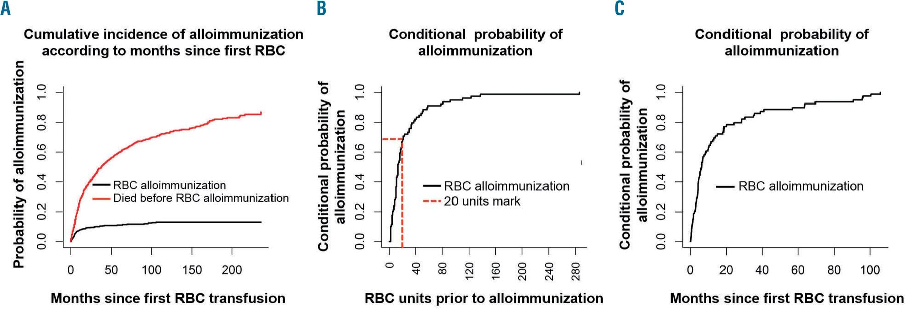 Figure 1.Cumulative incidence of red blood cell alloimmunization and time to development of alloantibodies. (A) Probability of alloimmunization with death as competing risk by months following first RBC transfusion; (B) 73% of alloimmunized patients developed alloantibodies within the period of transfusion of their first 20 units of RBC; (C) 50% of alloimmunized patients developed alloantibodies within 6 months after their first RBC transfusion.