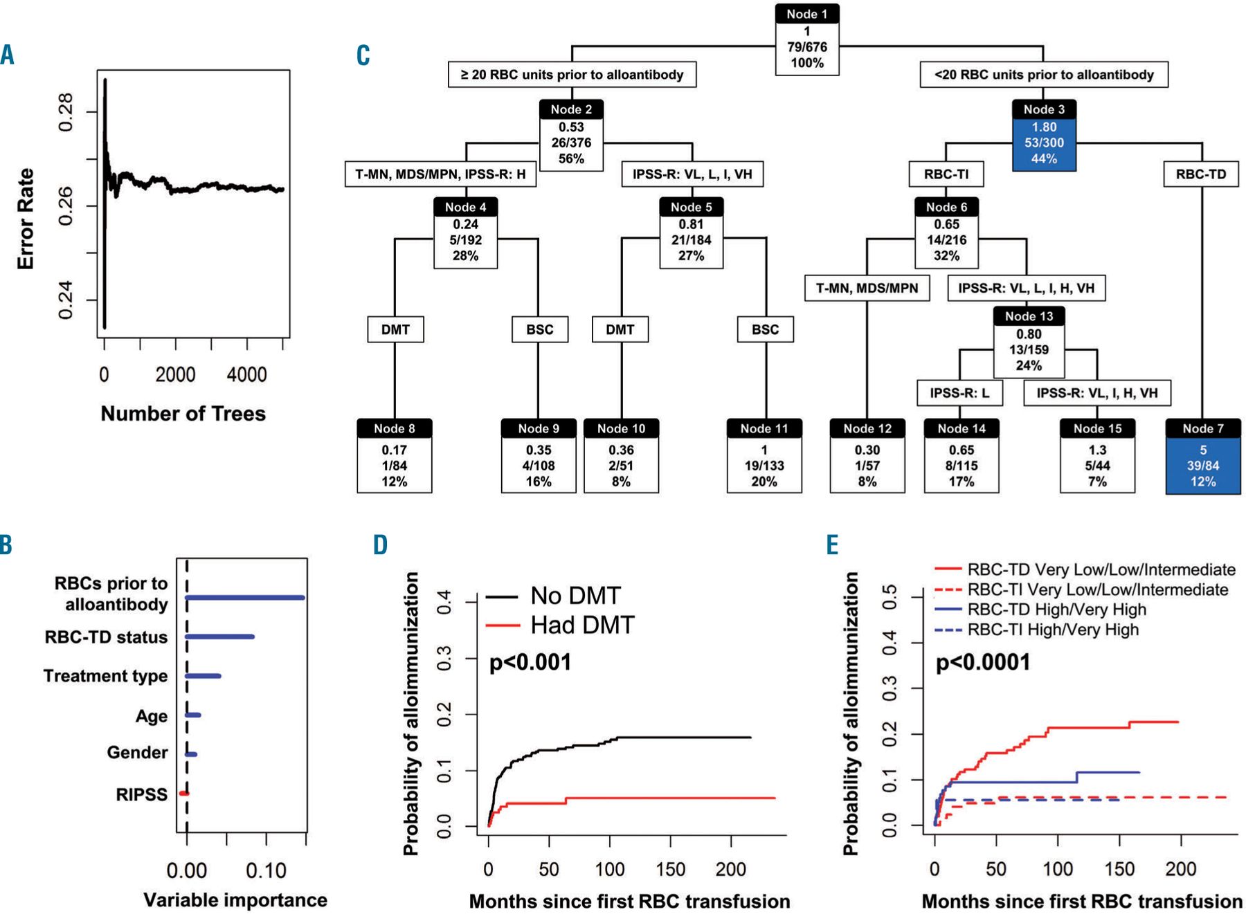 Figure 3.Recursive partition and random forest analysis to identify patients at higher risk of alloimmunization. (A-B) The random forest analysis predicted an error rate of 26%, thus indicating a 74% chance of correctly predicting alloimmunization risk. RBC units transfused prior to alloantibody, RBC-TD status and treatment type are major predictors of alloimmunization (C) Recursive partition analysis incorporating these variables produced a classification tree demonstrating that the majority of alloimmunized patients developed antibody within the first 20 units of RBC transfusion. Alloimmunization risk was highest in RBC-TD patients within the initial 20 units of RBC (hazard ratio 5; node 7) (D) Cumulative incidence of alloimmunization was significantly lower in patients treated with DMT (E) Cumulative incidence of alloimmunization was significantly higher in RBC-TD IPSS-R Very Low, Low, intermediate risk groups compared to RBC-TD High and Very High risk groups, while alloimmunization was significantly lower in RBC-TI patients in both groups. In Figure 3C: top, middle and bottom values in each node (box) indicate hazard ratio (HR), number of cases developing alloantibody divided by number of cases in that group and percentage of total cases, respectively. For example in node 7, the HR of developing an alloantibody was 5 (top number), 39/84 cases developed alloantibodies and this node represents 12% of the total cases. IPSS-R categories are Very Low (VL), Low (L), Intermediate (I), High (H), and Very High (VH). T-MN: therapy-related myeloid neoplasm; MDS/MPN overlap myelodysplastic/myeloproliferative neoplasm overlap syndrome. DMT: disease-modifying therapy; BSC: best supporting care; RBC-TD: RBC transfusion dependency; RBC-TI: RBC transfusion independent.