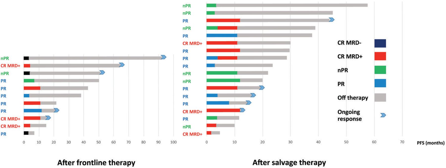 Figure 1.Response improvement and progression free survival. (A) After front-line therapy. (B) After salvage therapy. CR: complete remission; MRD: minimal residual disease; PR: partial remission; nPR: nodular partial remission. Three patients who discontinued treatment before first response assessment were not evaluable for response and/or survival.