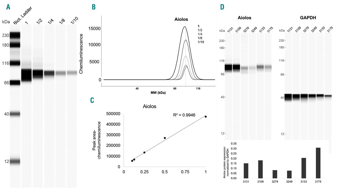 Standard curves were produced for each protein to evaluate the range of linearity over which the expression of each protein could be quantified. Briefly, each capillary contained the sample at a different dilution, and the protein detection was visualized as virtual blots, as exemplified by the use of Aiolos in Figure 3A. The peaks obtained for each dilution, which were obtained automatically by the program, have a distinct height and width, depending on the sample dilution (Figure 3B). Once they had been quantified the standard curve was generated (Figure 3C). After protein quantification, we compared the value obtained for each sample and each protein with the respective standard curve to ensure correct measurement. The limit of quantitation was set as signal-to-noise ratio of 10:1 in accordance with the guidelines from the European Directorate for the Quality of Medicine set out in the European Union Pharmacopoeia.8