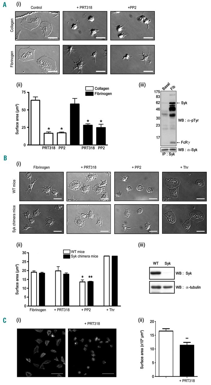 Figure 4.Syk promotes platelet spreading on fibrinogen downstream of glycoprotein VI but not in integrin αIIbβ3 outside-in signaling. Washed human platelets, or washed platelets from wild-type mice (WT mice), Syk chimera mice (Syk chimera mice) and mice expressing human GPVI (hGPVI mice) were allowed to adhere to fibrinogen or to collagen in the presence of either the Src inhibitor PP2 (20 μmol/L), the Syk inhibitor (5 μmol/L), thrombin (0.1 U/mL), or vehicle control, for 30 min (human platelets) or 45 min (mouse platelets) at 37°C followed by fixation with PFA. (A)(i). Representative DIC images of human platelets adhering to fibrinogen or collagen. Scale bars represent 5 μm. (A)(ii). Bar graph representing the surface area of platelets spreading on fibrinogen. Spreading is expressed as the mean±SEM in five or more random fields, in three separate experiments. Significance was determined by one- way ANOVA and Bonferroni multiple comparison test: *P<0.01. (A)(iii) Representative western blot from human platelets following adhesion to fibrinogen. Following immunoprecipitation of Syk, proteins were separated by sodium dodecyl sulfate-polyacrylamide gel electrophoresis and western blot for phosphotyrosine. Membranes were then stripped and reprobed for Syk to confirm equal protein loading. Blots are representative of three separate experiments. (B)(i). Representative DIC images of mouse platelets adhering to fibrinogen. Scale bars represent 5 μm. (B)(ii). Bar graph representing the surface area of platelets spreading on fibrinogen. Spreading is expressed as the mean±SEM in five or more random fields, in three separate experiments. Significance was determined using one-way ANOVA, with the Bonferroni post-hoc test: *P<0.05, **P<0.001. (B)(iii). Expression of Syk was measured by western blotting platelet whole-cell lysates with an α-Syk antibody. Membranes were then stripped and reprobed with an anti-α-tubulin antibody to confirm equal protein loading. Blots are representative of three separate experiments. (C)(i). Representative epifluorescence images of mouse platelets adhering to fibrinogen. Scale bars represent 10 μm. (C)(ii). Bar graph representing the surface area of platelets spreading on fibrinogen. Spreading is expressed as the mean±SEM in eight random fields, in five separate experiments (Mann-Whitney test, **P<0.01).