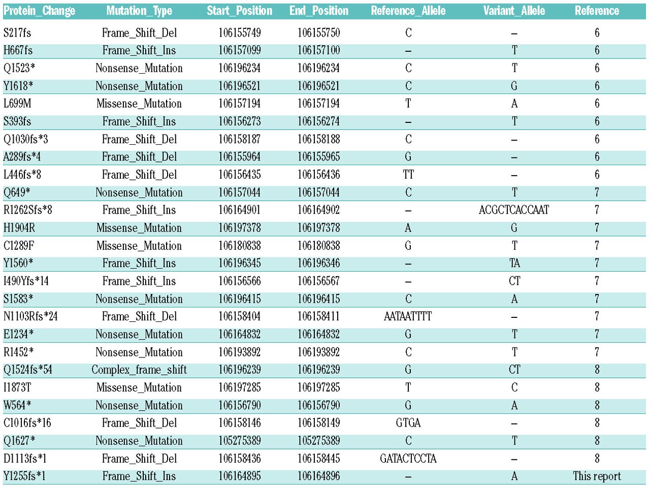 Table 1.List of all known TET2 mutations in blastic plasmacytoid dendritic cell neoplasm derived from the literature6–8 and this report.