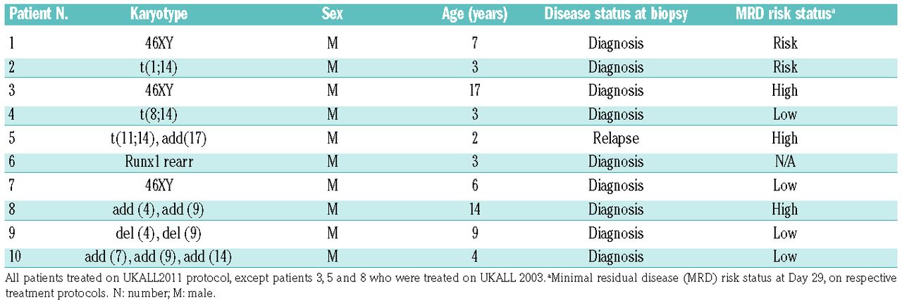 Bone marrow samples from 10 children, aged 2-17 years (median 5 years), diagnosed with T-ALL at presentation or relapse were collected with informed consent and approval of University Hospitals Bristol NHS Trust and London Brent Research Ethics Committee (Table 1). Mononuclear cells (MNC) were separated via density gradient centrifugation using Ficoll-Hypaque (Sigma-Aldrich, Gillingham, UK). MNC were suspended in 90% fetal calf serum (FCS, Thermo Scientific, Paisley, UK) and 10% dimethyl sulfoxide (DMSO, Origen Biomedical, Solihull, UK) and stored in liquid nitrogen prior to use. Samples from patients with a range of karyotypic abnormalities, diagnostic age and minimal residual disease (MRD) status were investigated.
