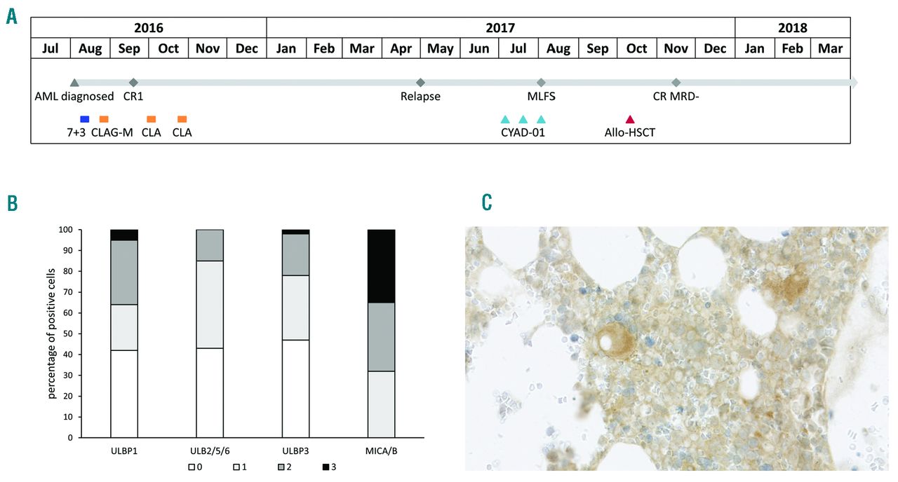 Figure 2.Treatment Course and immunohistochemistry analysis of NKG2D ligand expression in bone marrow sample taken before first CYAD-01 injection. Timeline of history of treatments and responses is shown (A). BM biopsy of patient prior to CYAD-01 treatment was subject to a range of IHC staining protocols specific for the following NKG2DL: MICA/MICB, ULBP1, ULBP2/5/6, ULBP3. In addition, a sample of each was prepared applying standard hematoxylin and eosin (H&E) staining (data not shown). All samples were examined and graded by light microscopy. 100 presumptive neoplastic cells were counted and analysed, in terms of staining characteristics, using a “H-score” approach. The intensity of membranous staining was graded for each cell, as follows: 0 – no staining; 1 – minimal staining (each positive cell scored “1”); 2 – mild staining (each positive cell scored “2”); 3 – moderate/marked staining (each positive cell scored “3”). The percentage of positive cells for each intensity staining and each ligand is represented in (B). Representative staining of MICA/B is shown in (C).