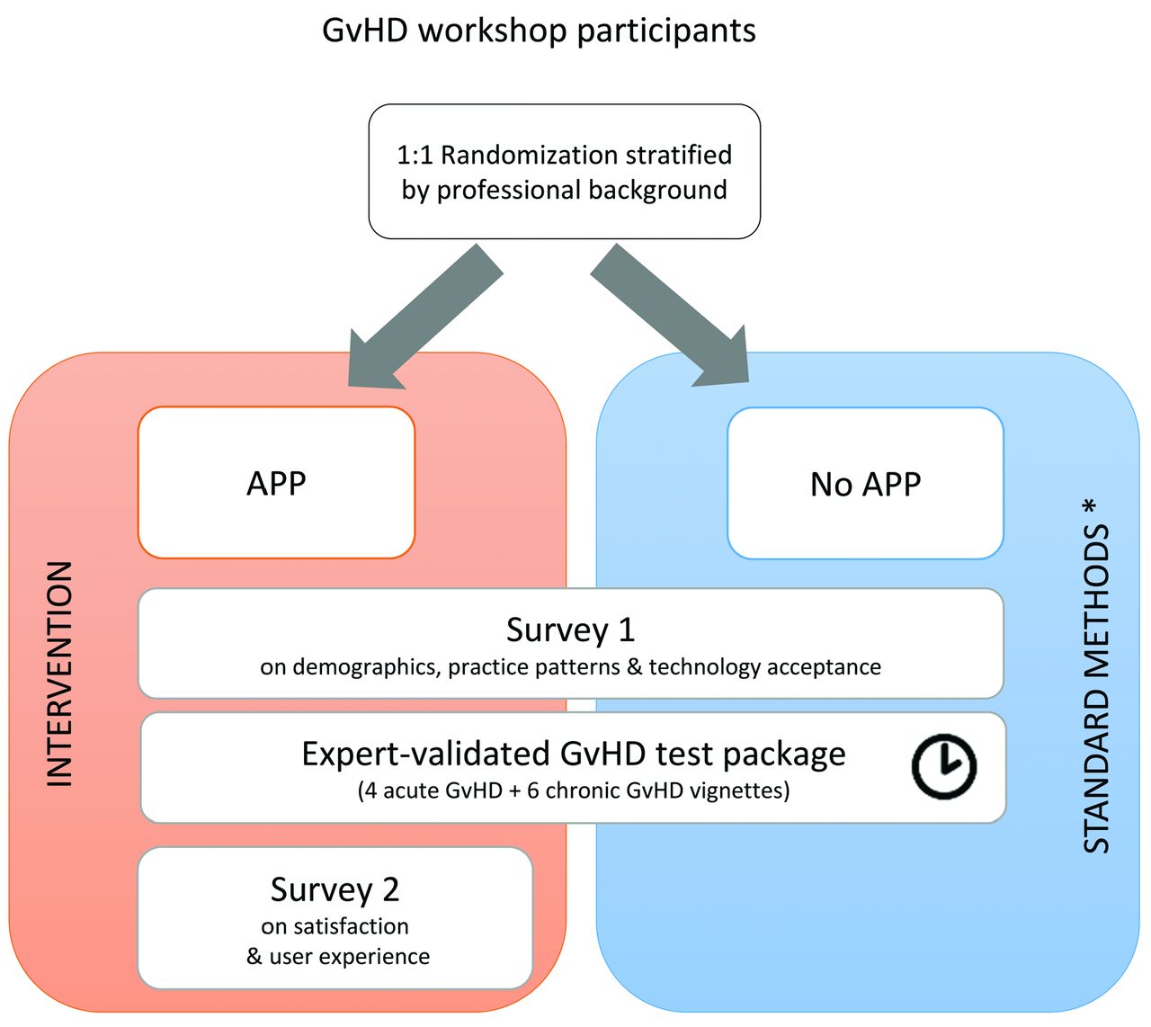 Figure 1.Study Design. APP: eGVHD App; GvHD: graft-versus-host disease. *E.g. own knowledge, ‘fast facts’ sheets, scoring sheets, standard operating procedures, copies of original guideline publications, or any other chosen resource.