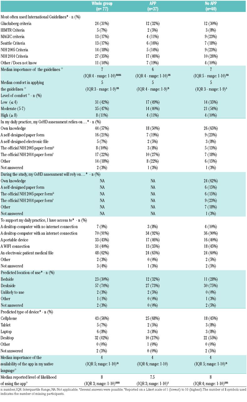 A total of 103 individuals participated in the workshops (Figure 2). Seventy-eight professionals met the inclusion criteria and were randomized. One participant dropped-out due to a medical emergency in the clinic, hence data from 77 professionals were available for analysis: 37 in the “APP” Group and 40 in the “No APP” group. There was a median of 8 participants per center (range: 7–20) (Online Supplementary Table S1). Professional characteristics were similar in both groups (Table 1). The majority of participants were medical doctors (75%), female (64%), and had a median age of 39 years (IQR: 20, range 22–62). Professionals reported a median experience in allogeneic HCT of six years (IQR: 11, range 0–32), and evaluated a median of one allogeneic HCT patient for GvHD per week (IQR: 5, range 0–30). The majority of healthcare professionals reported having expertise in adult patient care. Self-reported proficiency in English was high with a median score of 7 (IQR: 1; range: 2–10) on a Likert scale of 1 (not at all fluent) to 10 (extremely fluent).