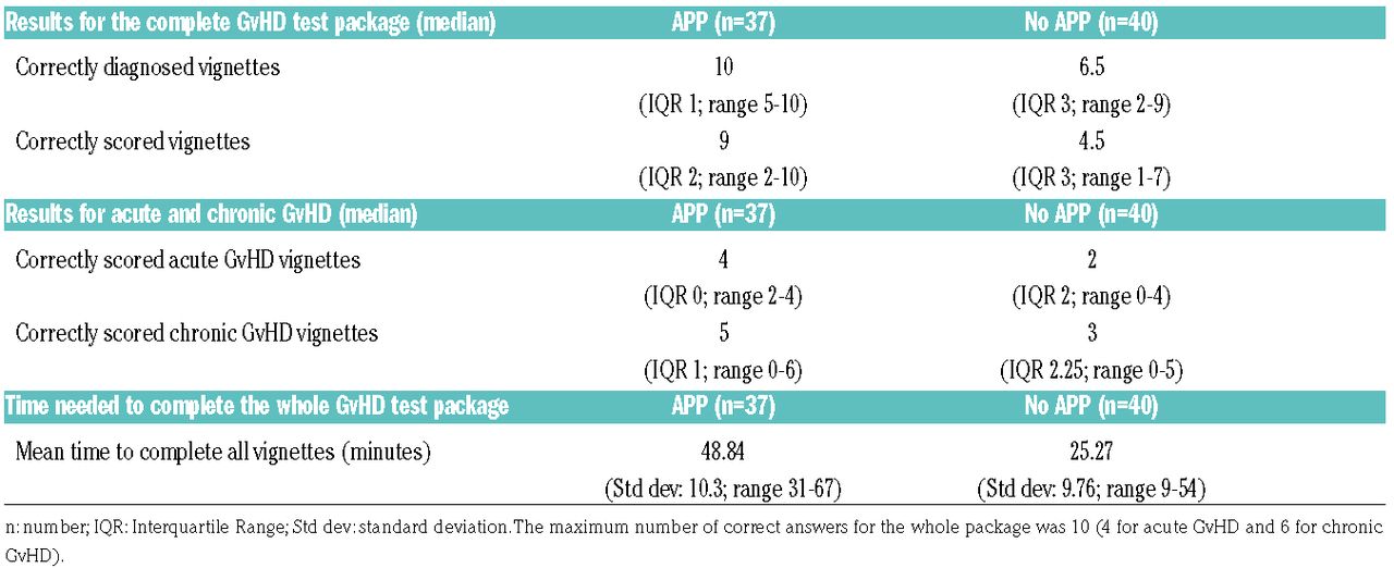 In this study, participants in the control group were allowed to use any method of their choice to support their GvHD assessment, except for using the eGVHD App. Yet GvHD assessment results in the “APP” group, were strikingly better. We believe that the superior performance of the App users could be due to a number of factors. First, App users were provided with the most up-to-date guidelines,1 without having to look them up actively. Second, similar to using comprehensive paper data collection forms, they were encouraged to work in a systematic fashion: they had to evaluate every possible aspect of acute or chronic GvHD (to avoid overlooking less intuitive aspects of the disease) in order to select the appropriate scoring system and come to the correct severity evaluation result. Finally, the digital interface also offered users a number of advantages such as the presence of pictures and definitions to support recognition of GvHD-related features, the use of ‘skip-logic’ principles (which allows healthcare professionals to avoid wasting time on filling in information with no direct impact on diagnosis or severity scoring), the automatic computation of the resulting score, and the option of generating a report.