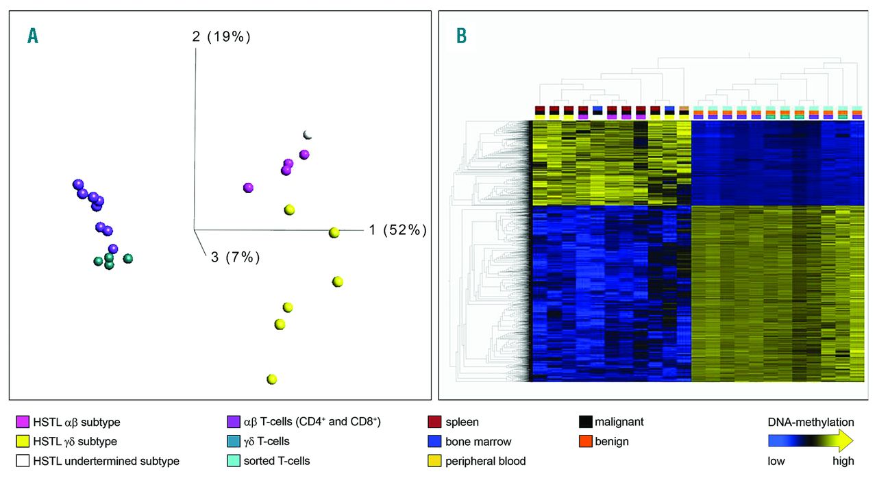Figure 1.Genome-wide methylation signature of HSTL compared to normal T-cell subtypes. Unsupervised principal component analysis (PCA) of HSTL samples and benign controls of the TCRαβ and TCRγδ subtypes (HSTL αβ = pink; HSTLγδ = yellow; HSTL undetermined = white; non-neoplastic γδ T cells = turquoise; αβ T-cells (CD4 and CD8) = violet). Using σ/σmax= 0.5, 5,376 of 450,959 differentially methylated CpG loci are visualized. (B) Heatmap and hierarchical cluster analysis resulting from a t-test using FDR< 1*10−5; 4,113 of 450,959 differentially methylated CpG loci are visualized in columns. The upper row points to the different subtypes of entity and material. X/Y chromosomes and rs-tags are excluded. Linkage: weighted average.