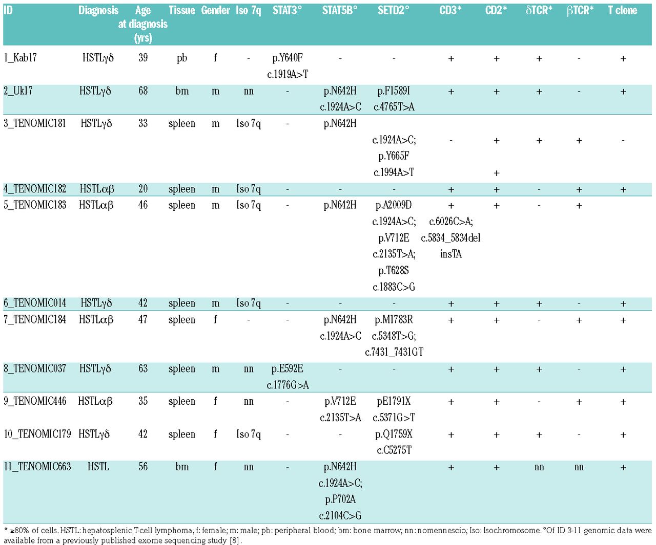 We included MACS-sorted CD8, CD4 (TCR αβ) and TCR γδ T cells from buffy coats of four healthy blood donors (males, mean age 37 yrs) as controls. The study was approved by the institutional review board of the Christian-Albrecht-University (ID: D405/10). Nine cases were obtained from the Tenomic database, which is approved by the ethical committee CPP-Ile-de-France-IX-08-009. The genomic data of these patients (ID 3-11) were available from a previously published exomesequencing study.8 In two patients (ID 1, 2) SETD2 was analysed by means of a custom Ion AmpliSeq DNA panel (see supplement). For all patients, exons of the genes STAT3 and STAT5B containing hot-spot mutations were amplified from genomic DNA by polymerase chain reaction and Sanger sequenced, in addition to the exome data (Online Supplementary Table S1, Online Supplementary Methods).