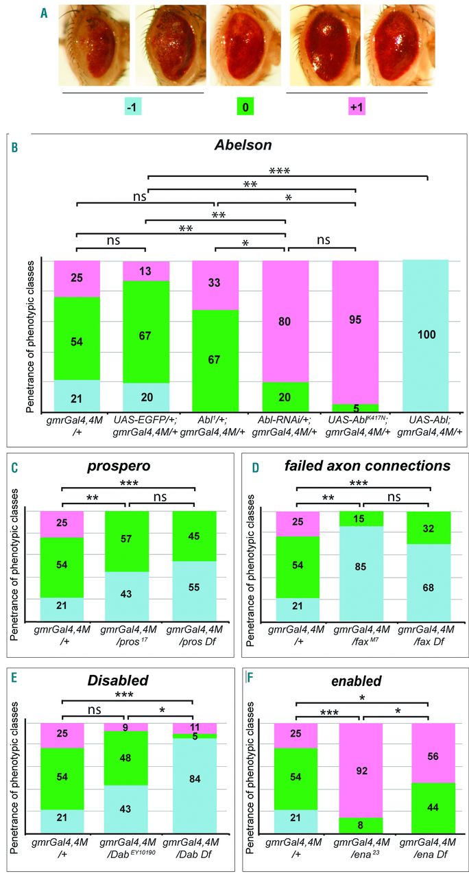 Figure 2.BCR-ABL1 expression affects ommatidia development by altering the dAbl signaling pathway. (A) Adult eyes showing the phenotypic classes used to quantify the severity of the variable phenotype due to BCR-ABL1 expression in eye cells committed to terminal differentiation. Posterior is on the left. Class 0 (green) corresponds to the average phenotype shown by gmrGal4, UAS-BCR-ABL1 4M flies; the ommatidia are almost totally absent, the eye depigmented region is very small and the eye appears flatter than that of wild-type eyes. Class −1 (pale blue) corresponds to more severe phenotypes: the eyes are even flatter than class 0 eyes and the depigmented area is enlarged including a dorso-ventral sector in the most posterior region of the eye. Class +1 (pink) corresponds to less severe phenotypes: a few ommatidia are visible, the eyes are more bulging and the depigmented area is absent indicating better eye cell differentiation. (B-F) Adult eyes from flies of the indicated genotypes were classified to evaluate the frequency of the three phenotypic classes. (B) A piled histogram chart showing the frequencies of the different phenotypic classes in flies expressing BCR-ABL1 (gmrGal4,4M/+), co-expressing BCR-ABL1 and the EGFP (UAS-EGFP/+;gmrGal4,4M/+), expressing BCR-ABL1 but having a partial loss of the endogenous Abl gene through the heterozygous Abl1 mutation (Abl1/+;gmrGal4,4M/+), RNAi targeting Abl (Abl-RNAi/+;gmrGal4,4M/+), expression of a dominant negative dAbl mutant (UAS-AblK417N;gmrGal4,4M/+) or overexpression of the wild-type Abl protein (UAS-Abl;gmrGal4,4M/+). (C-F) Piled histogram charts showing the frequencies of the three phenotypic classes in flies expressing BCR-ABL1 (gmrGal4,4M) and heterozygous for a loss of function allele or for a deletion of genes that behave as genetic modifiers of the embryonic lethality due to Abl LOF: prospero (C), failed axon connection (D), Disabled (E) and enabled (F). The statistical comparisons were conducted using a Mann-Whitney test (*P<0.05, **P<0.01, ***P<0.001).