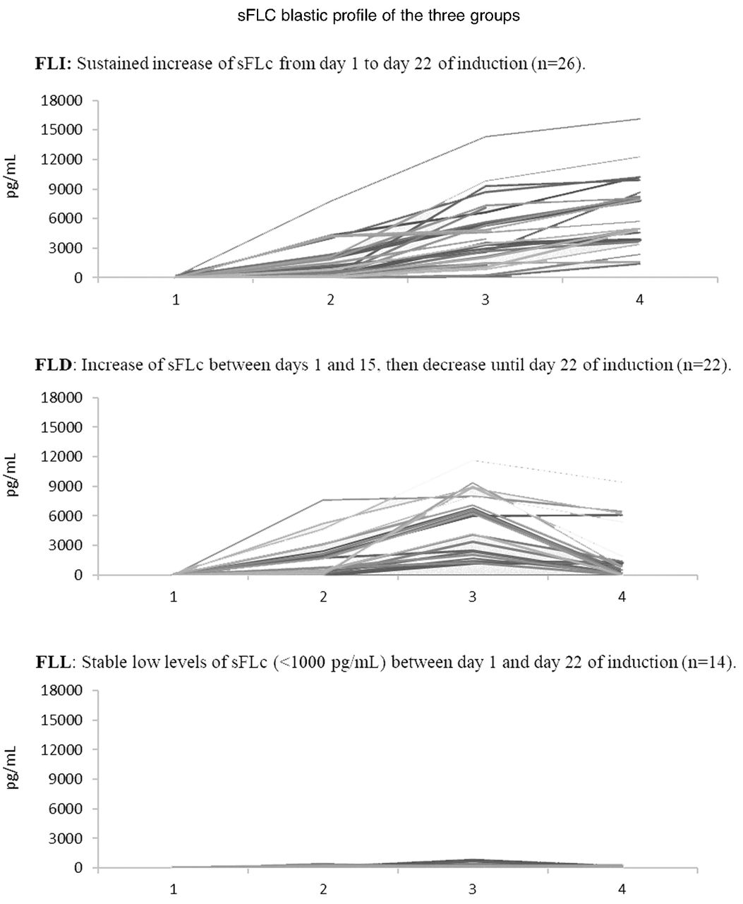 Between May 2016 and January 2018, 63 AML patients were included in the study. sFLc were ultimately available for 62 patients. Their median age was 59 years (range, 29-71) and median follow-up for alive patients was 541 days (range, 154-787). The patients’ characteristics are shown in Table 1. A total of 242 samples were analyzed during induction. The median sFLc at day 1 (n=62), day 8 (n=62), day 15 (n=59) and day 22 (n=59) were 2 (range, 0-234), 321 (range, 0-7750), 2952 (range, 0-14284) and 1390 (range: 13-16088) pg/mL, respectively. Analysis of the results revealed three sFLc kinetic profiles: (i) a sustained increase from days 1 to 22 (FLI group), (ii) an increase from days 1 to 15, then a decrease at day 22 (FLD group) and (iii) stable, low levels (<1000 pg/mL) throughout, from days 1 to 22 (FLL group) (Figure 1). Twenty-six patients (42%) were classified as FLI, 22 (35%) as FLD and 14 (23%) as FLL. Three patients who achieved neutrophil recovery before day 22 with a sustained sFLc increase from days 1 to 15 were classified as FLI. Two patients who displayed a sustained sFLc increase from days 1 to 15 (>1000 ng/mL), then stable sFLc were classified as FLD. Median sFLc at days 1, 8, 15 and 22 were as follows for the three groups: FLI: 2 (range, 0-234), 724 (range, 0-7750), 3673 (range, 65-14284) and 5753 (range, 1390-16088) pg/mL; FLD: 6 (range, 0-177), 1229 (range, 4-7666), 6019 (range, 1217-11640) and 684 (range, 14-9428) pg/mL; and FLL: 0 (range, 0-34), 60 (range, 0-419), 124 (range, 0-800) and 81 (range, 13-213) pg/mL. Although median sFLc were similar on day 1 (P=0.18), significant differences were observed between the three groups at days 8 (P=0.001), 15 (P<0.001) and 22 (P<0.001). Of note, median sFLc were significantly different between the FLI and FLD groups only at day 22 (P<0.001).