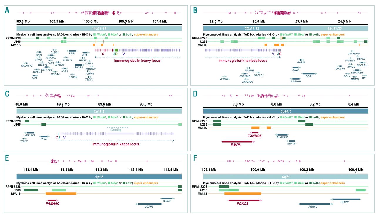 Figure 6.Chromosomal breakpoints in MYC translocation partners’ regions. (A) IGH locus at 14q32.33. (B) IGL locus on 22q11.22-22q11.23. (C) IGK locus on 2p11.2. (D) TXNDC5/BMP6 locus on 6p24.3. (E) FAM46C locus on 1p12. (F) FOXO3 locus on 6q21. Yellow bars show super-enhancers identified in the MM.1S cell line; green bars show topologically associated domain (TAD) boundaries identified in RMPI-8226 and U266 cell lines. Ig genes are separated into constant (C, red), joining (J, blue), diversity (D, green) and variable (V, purple) regions; non-Ig highly-expressed genes (present in >95% of patients with log2 normalized counts >10 in the dataset of 571 cases tested by RNA sequencing) are in red and other genes in gray.