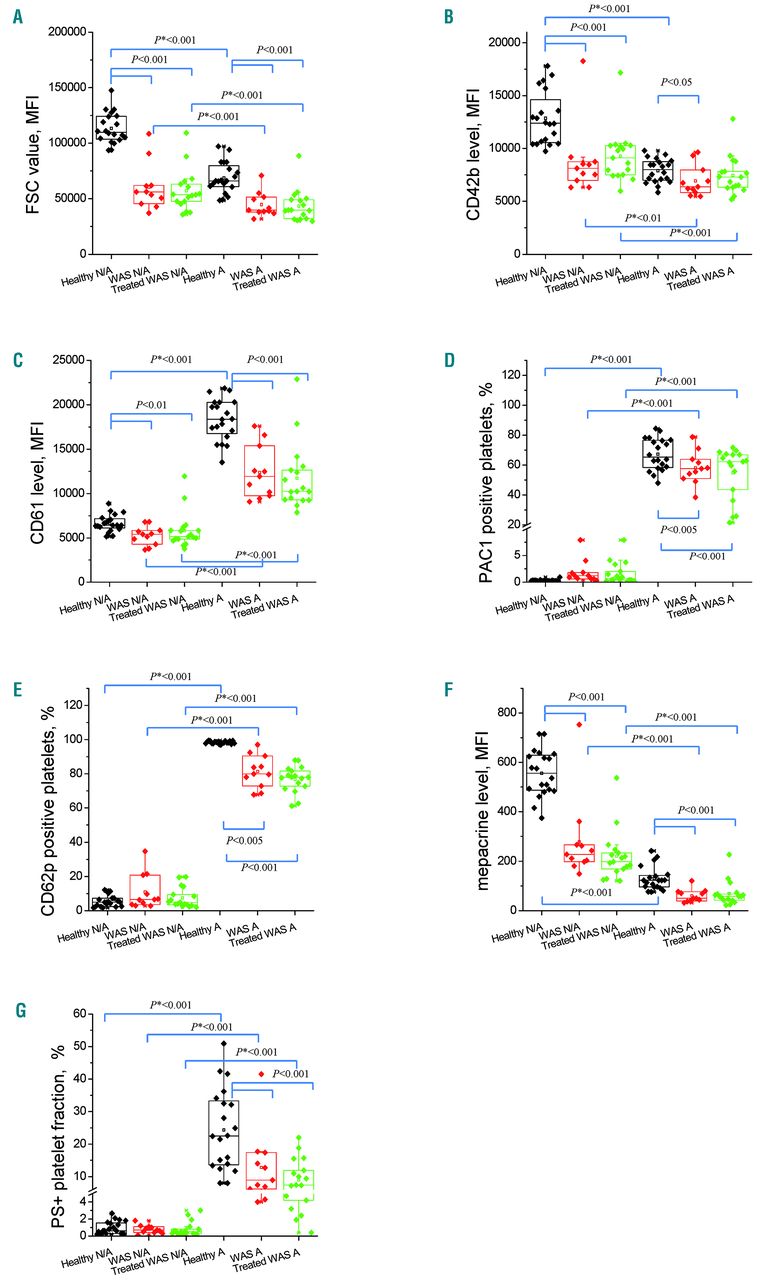 Figure 2.Functional response of the Wiskott-Aldrich syndrome and healthy platelets. (A-G) Whole blood platelets were stimulated (designated by A) or not (designated N/A) with thrombin receptor agonist peptide-6 plus collagen-related peptide and analyzed by flow cytometry. Parameters shown for healthy children (n=21, age 0-13 years, median 5.0) and Wiskott-Aldrich patients (17 treated with romiplostim, 11 non-treated) are: platelet size, determined from the forward scatter measured by mean fluorescence intensity (MFI) (A); CD42b level, MFI (B); CD61 level, MFI (C); PAC1-positive platelets, % (D); CD62p-positive platelets, % (E); dense granule release determined by mepacrine level, MFI (F); and phosphatidylserine-positive platelet fraction, % (G). P: Mann–Whitney U-test, P*:Wilcoxon signed-rank test. FSC: forward scatter, WAS: Wiskott-Aldrich syndrome; PS+: phosphatidylserine-positive.