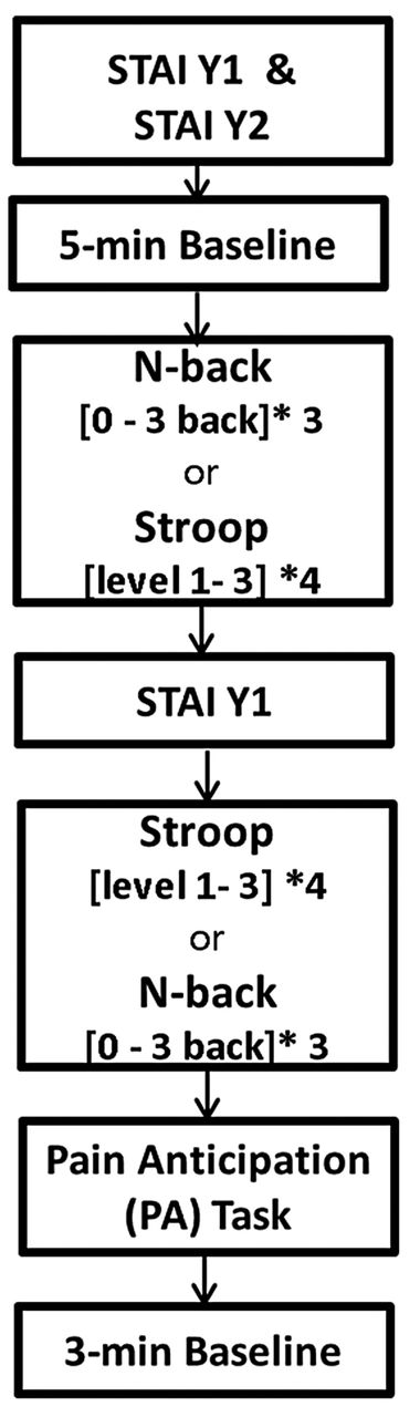 Figure 1.Time sequence of the study protocol. The subjects were randomly assigned to perform the N-back or Stroop test first. STAI: State-Trait Anxiety Inventory; Y-1: Sate questionnaire; Y-2 Trait questionnaire.