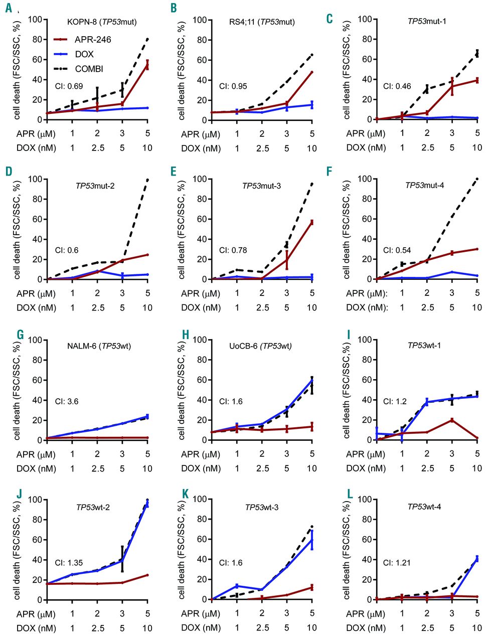 Figure 5.APR-246 synergizes with doxorubicin. Synergistic activity of APR-246 in combination with the DNA-damage-inducing agent doxorubicin in TP53mut B-cell precursor (BCP)-acute lymphoblastic leukemia (ALL) cell lines (A, B) and TP53mut primograft leukemias (C-F) leading to doxorubicin re-sensitization, in contrast to no increased activity compared to treatment with doxorubicin alone in TP53wt cell lines (G, H) and TP53wt primograft ALL (I-L). Cell death (forward/side scatter criteria, flow cytometry) after exposure (primografts 24 h, cell lines 48 h) at indicated concentrations of APR-246 (APR), doxorubicin (DOX) or the combination (COMBI, 3 h APR-246 pre-incubation). Mean values ± standard deviation (SD) of three independent experiments, each performed in triplicate (cell lines: A, B, G, H). Mean values ± SD, three measurements (primografts: C-F, I-L). Combination indices (CI) indicating a strong synergistic (CI 0.1-0.3), a synergistic (CI <1), an additive (CI=1) or an antagonistic effect (CI>1) upon combination.