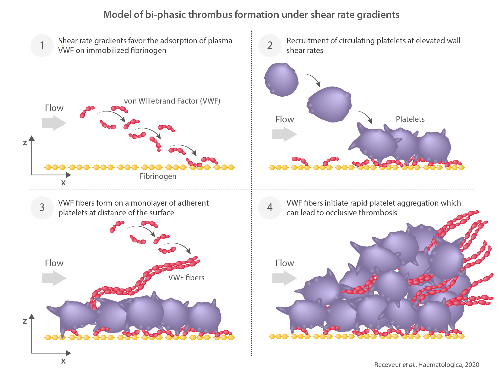 Figure 7.Model of bi-phasic thrombus formation under shear rate gradients. Shear rate gradients (SRG) found at the site of vessel stenosis favor the adsorption of plasma von Willebrand factor (VWF) on immobilized weak adhesive proteins such as fibrinogen (1). This process allows recruitment of circulating platelets at elevated wall shear rates (2). VWF fibers are then forming on a monolayer of adherent platelets at distance of the surface (3). The VWF fibers initiate rapid platelet aggregation which can lead to occlusive thrombosis (4).