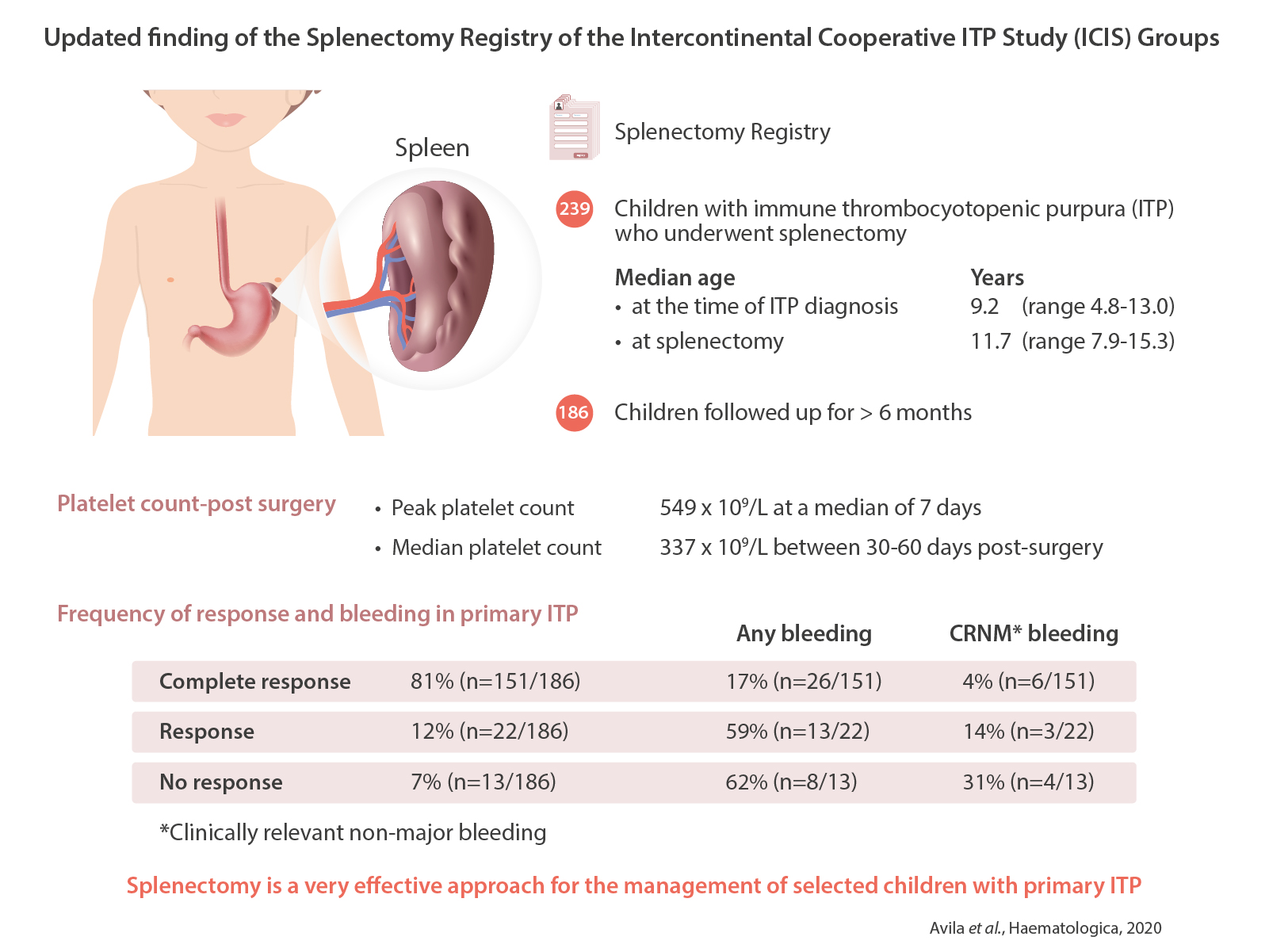 In conclusion, splenectomy is a very effective approach for the management of selected children with primary ITP as evidenced by platelet count recovery. Although low, the risk of adverse events both peri-operative and in the long-term should be carefully considered when indicating this therapeutic modality. The only predictor of response available prior to indication of splenectomy is patient age; the older the patient, the higher the odds of response.