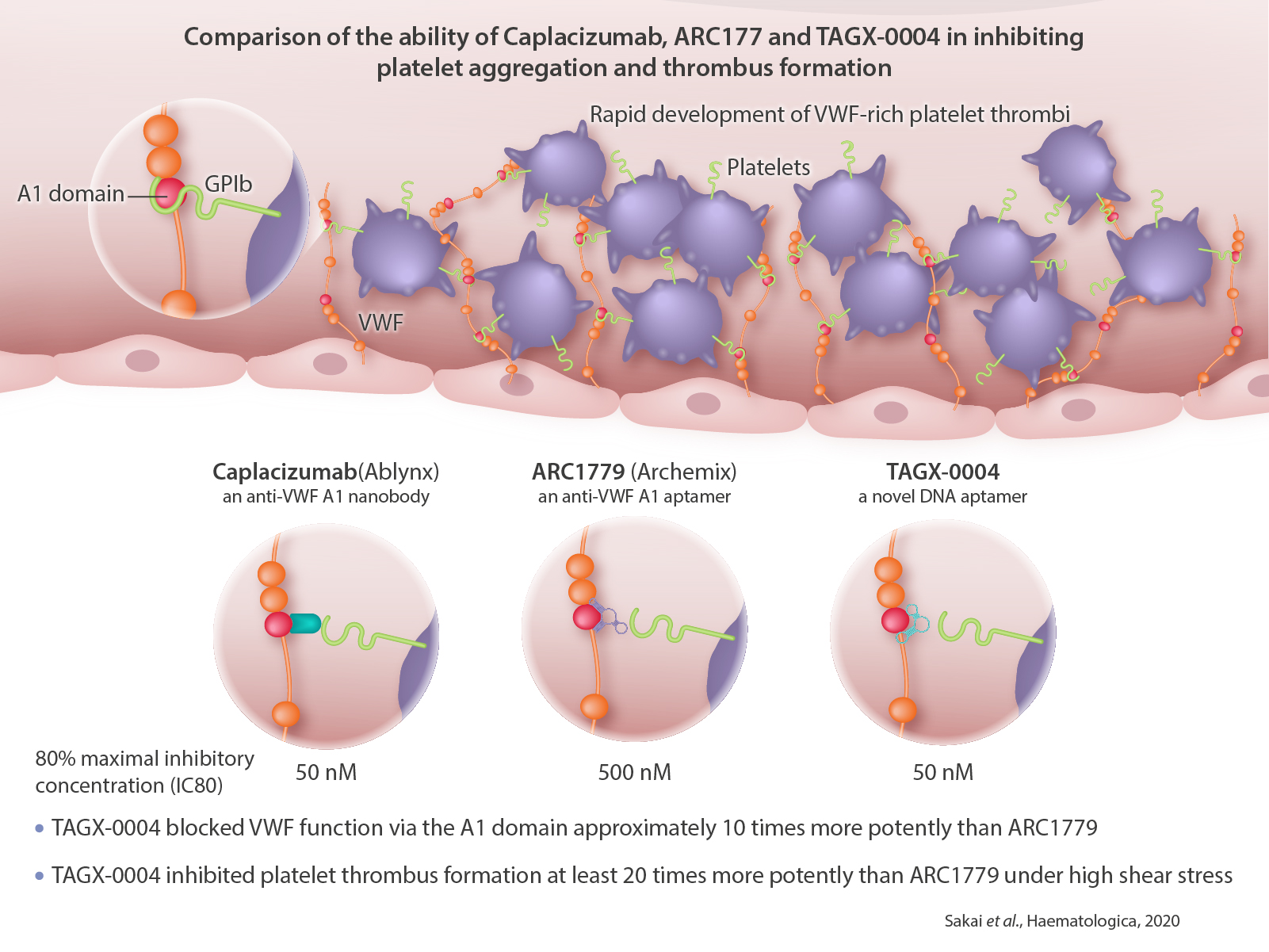 In addition, caplacizumab was used in the clinical study and approved as a bivalent nanobody which has two binding sites to the target. On the other hand, two aptamers used in this study were formed as monovalent. It is known that the direct comparison of an affinity of monovalent entity with an avidity of bivalent entity is not straightforward. Nevertheless, it is intriguing that TAGX- 0004 has shown a comparable inhibitory effect against caplacizumab in the studies we performed, and how the bivalent form of TAGX-0004, which is not available though, behaves in the same experiments.