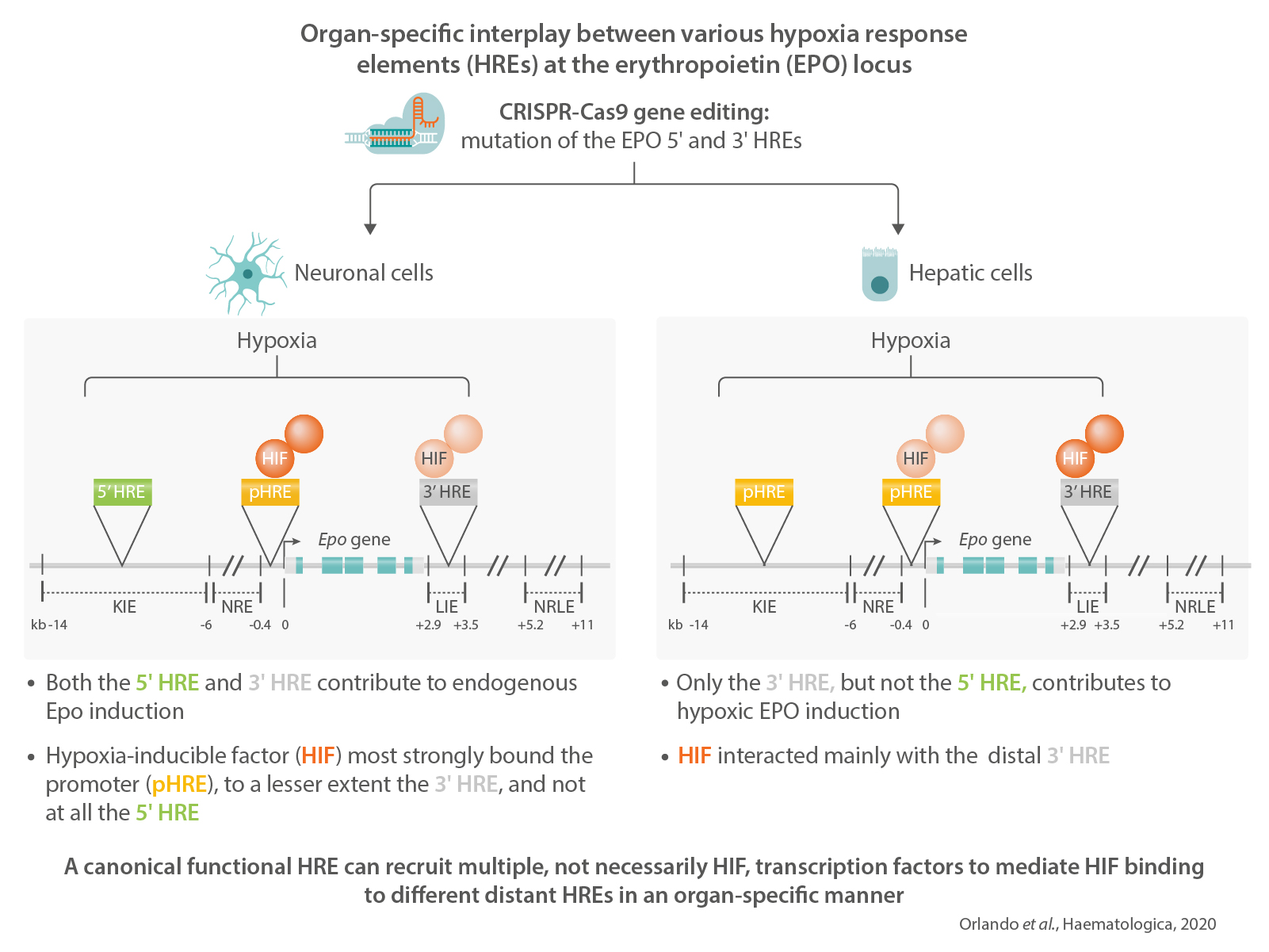 While it is well-established that distal hypoxia response elements (HREs) regulate hypoxia-inducible factor (HIF) target genes such as erythropoietin (Epo), an interplay between multiple distal and proximal (promoter) HREs has not been described so far. Hepatic Epo expression is regulated by a HRE located downstream of the EPO gene, but this 3' HRE is dispensable for renal EPO gene expression. We previously identified a 5' HRE and could show that both HREs direct exogenous reporter gene expression. Here, we show that whereas in hepatic cells the 3' but not the 5' HRE is required, in neuronal cells both the 5' and 3' HREs contribute to endogenous Epo induction. Moreover, two novel putative HREs were identified in the EPO promoter. In hepatoma cells HIF interacted mainly with the distal 3' HRE, but in neuronal cells HIF most strongly bound the promoter, to a lesser extent the 3' HRE, and not at all the 5' HRE. Interestingly, mutation of either of the two distal HREs abrogated HIF binding to the 3' and promoter HREs. These results suggest that a canonical functional HRE can recruit multiple, not necessarily HIF, transcription factors to mediate HIF binding to different distant HREs in an organ-specific manner.