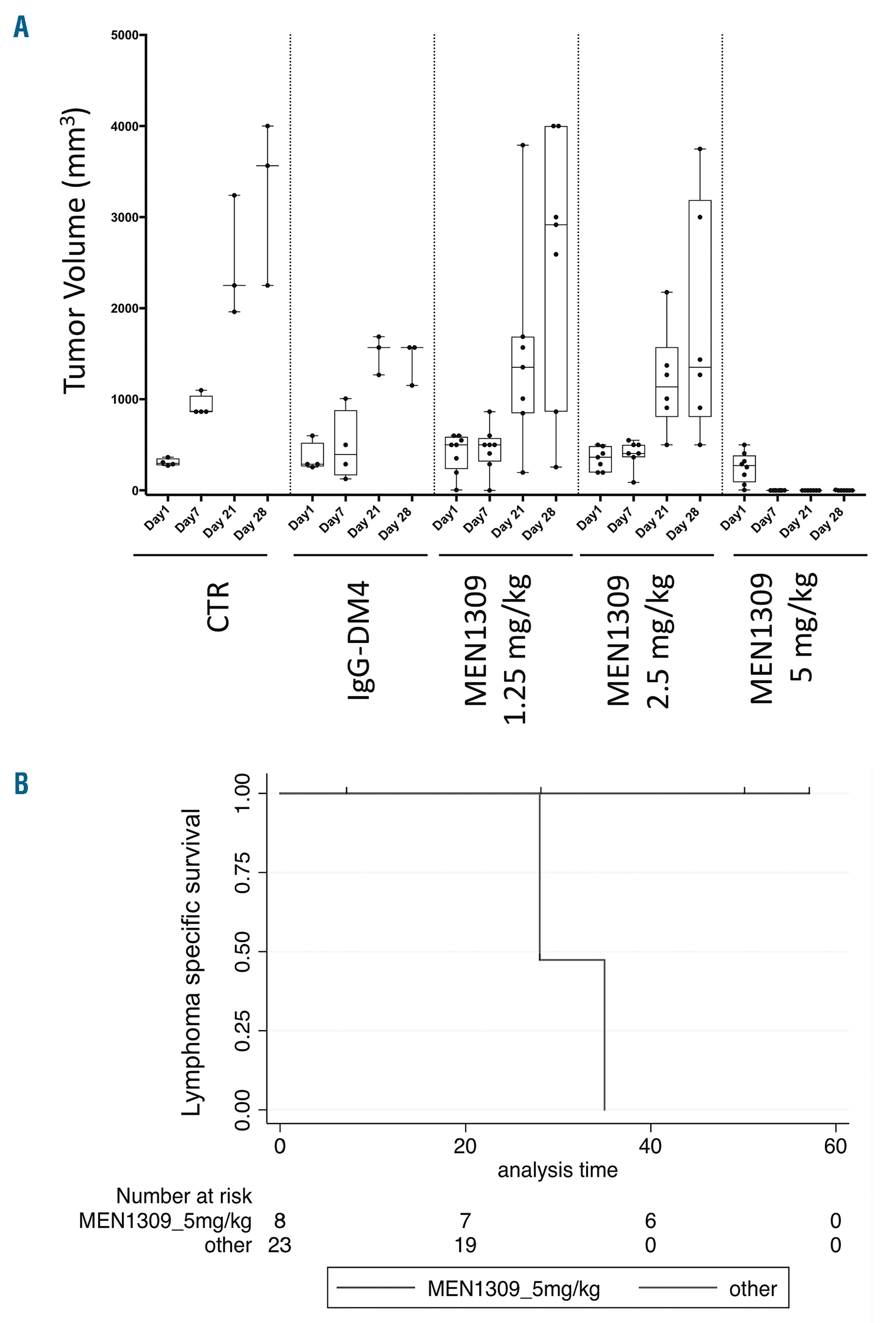 Figure 2.MEN1309/OBT076 as single agent has in vivo antitumor activity in the activated B-cell like diffuse large B-cell lymphoma OCILY10 xenograf t mo del. Trea tme nt with MEN1309/OBT 076 a n d IgG-DM4 st arted when tumors became visible (100mm3). (A) Control (CTR) group, n=4; IgG-DM4 group, n=4; MEN1309/OBT076 1.25 mg/kg, n=8; MEN1309/O BT076 2 .5 mg/kg, n=7; MEN1309/OBT076 5 mg/kg, n=8. In each box-plot, the line in the middle of the box represents the median and the box extends from the 25th to the 75th percentile (IQ: interquartile range). Each dot represent a mouse. xaxis: days of treatment. y -axis: tumor volume expressed in mm3. (B) Kaplan-Meier LSS (lymph oma specific sur vival ). MEN 1309/OBT076 (5 mg /k g) versu s all other groups together. P<0.0001.