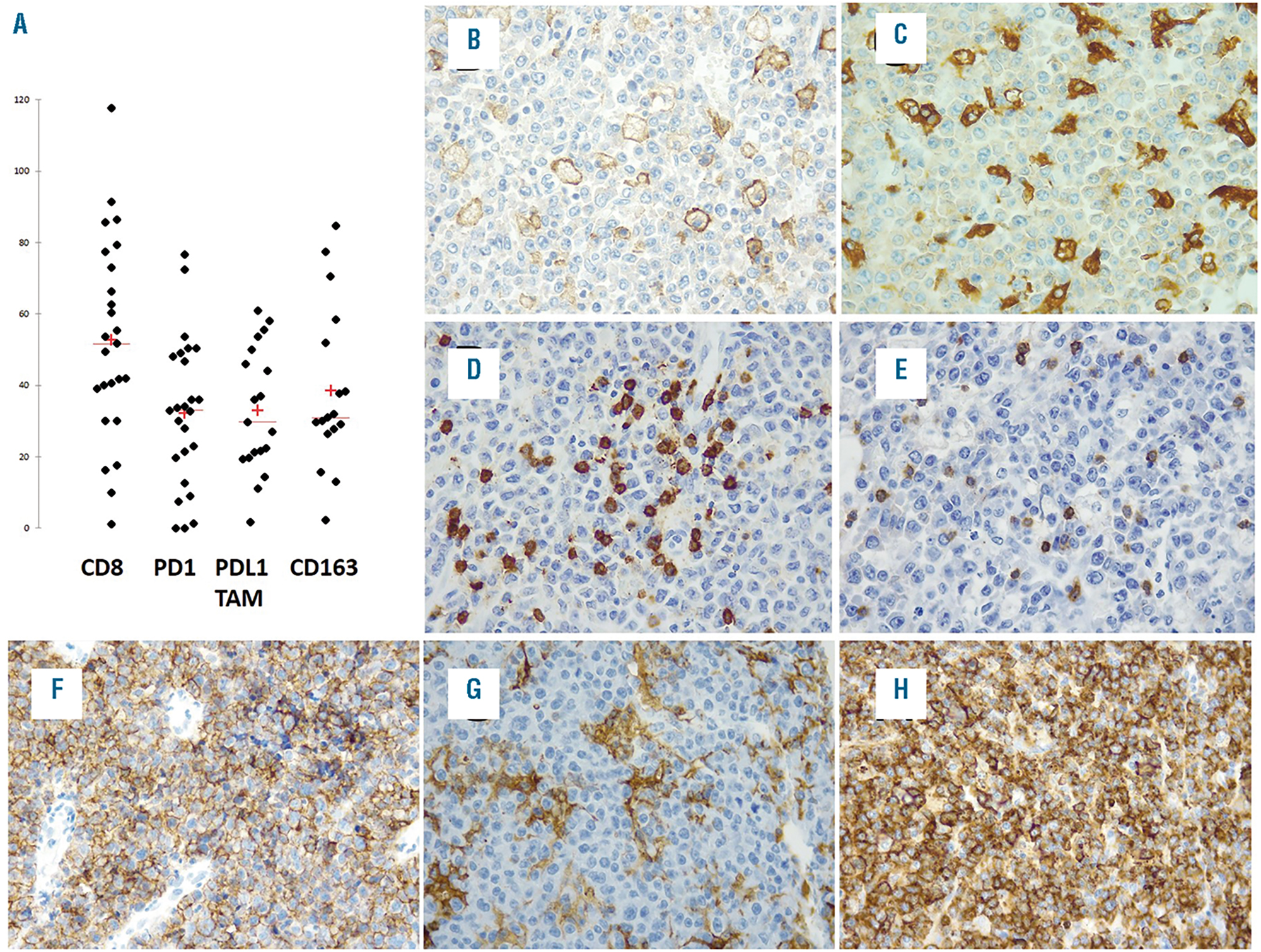 Figure 5.Phenotype of microenvironmental and neoplastic cells in plasmablastic lymphoma. (A) Scattergram illustrating the mean and range of expression values after quantification of the immunohistochemical expression of CD8, PD1 in lymphocytes and PD-L1 and CD163 in histiocyte/dendritic cell populations. (B) Representative image of a case with a mean of 36 PD-L1-positive non-neoplastic cells. (C) The same case showed a mean of 37 CD163-positive histiocytes. (D) The mean expression of CD8-positive cells in this representative case was 53. (E) PD1 identified a different T-cell subpopulation (mean of 36 PD1-positive cells in this representative example, case n. 25). (F) PD-L1 expression by neoplastic cells was identified in five out of 24 cases evaluated (20%). (G) MHCII protein/HLA (DP, DR) was, in most cases, restricted to histiocyte and endothelial cell populations. (H) MHCII protein/HLA (DP, DR) expression was identified in the neoplastic cells in three out of 25 cases tested (12%). Two of the three cases showed cytoplasmic granular and membranous staining (as illustrated in the figure) and one case had a membranous pattern.