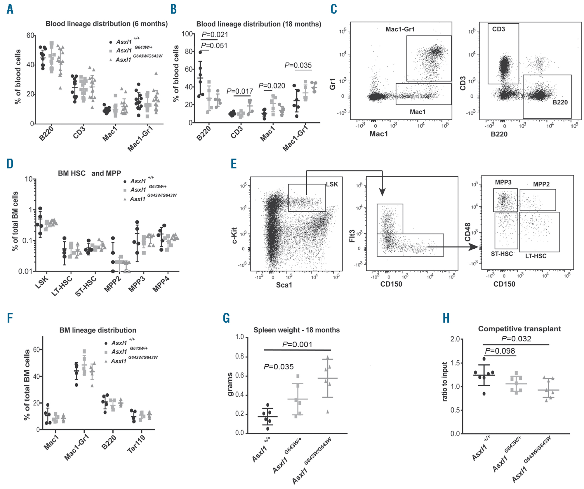 Figure 2.The ASXL1G643W variant has minimal impact on normal hematopoiesis. (A) Fluorescence-activated cell sorting (FACS)-based analysis of the peripheral blood of 6-month old Asxl1+/+, Asxl1G643W/+ and Asxl1G643W/G643W mice (n>11 mice in each experimental group). The relative distribution of B cells (B220), T cells (CD3), neutrophilic granulocytes (Mac1-Gr1) and other monocytic/granulocytic cells (Mac1) was analyzed. (B) FACS-based analysis of the peripheral blood of 18-month old Asxl1+/+, Asxl1G643W/+ and Asxl1G643W/G643W mice (n>5 mice in each experimental group). The relative distribution of B cells (B220), T cells (CD3), neutrophilic granulocytes (Mac1-Gr1) and other monocytic/granulocytic cells (Mac1) was analyzed. (C) Representative FACS profiles of the data from (A-B) with the gating strategy indicated. The FACS profile represents an Asxl1+/+ control mouse. See the Online Supplementary Figure S1 for representative FACS plots of Asxl1G643W/+ and Asxl1G643W/G643W animals. (D) FACS-based analysis of bone marrow hematopoietic stem cell (HSC) and multipotent progenitor (MPP) subsets in 6-month old Asxl1+/+, Asxl1G643W/+ and Asxl1G643W/G643W mice (n>5 mice in each experimental group). (E) Representative FACS profiles of the data from (D) with the gating strategy indicated. The FACS profile represents an Asxl1+/+ control mouse. See the Online Supplementary Figure S1 for representative FACS plots of Asxl1G643W/+ and Asxl1G643W/G643W animals. (F) Lineage distribution of mature bone marrow (BM) subsets in 6-month old Asxl1+/+, Asxl1G643W/+ and Asxl1G643W/G643W mice (n>5 mice in each experimental group). The relative distribution of B cells (B220), T cells (CD3), neutrophilic granulocytes (Mac1-Gr1) and other monocytic/granulocytic cells (Mac1) was analyzed. (G) Spleen weights of 18-month old Asxl1+/+, Asxl1G643W/+ and Asxl1G643W/G643W mice (n>5 mice in each experimental group). (H) Competitive BM transplantation of 1:1 mixtures of CD45.2 donor BM cells from 6-month old Asxl1+/+, Asxl1G643W/+or Asxl1G643W/G643W mice and CD45.1 competitor cells into lethally irradiated CD45.1 recipient mice. The ratio of CD45.2 to CD45.1 in peripheral blood is depicted (n>7 mice in each experimental group).