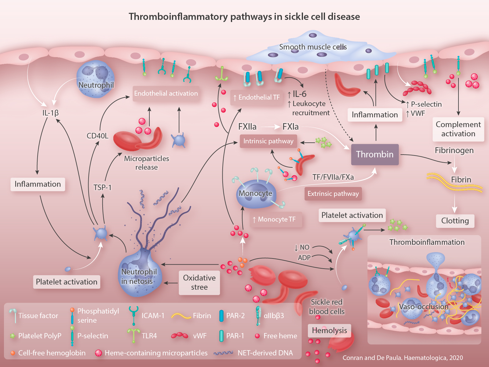 Figure 1.Thromboinflammatory pathways in sickle cell disease. Hemolytic and ischemia-reperfusion events (due to vaso-occlusion) drive inflammation and hemostatic alterations in sickle cell disease (SCD). Hemolysis leads to the release of cell-free hemoglobin, heme and other red blood cell contents into the vascular environment, causing nitric oxide depletion and contributing to platelet activation. Non-protein bound heme activates the endothelium (with some participation of tolllike receptor 4), induces tissue factor (TF) expression and activation in monocytes and endothelial cells, neutrophil extracellular trap formation, leukocyte and complement activation. Endothelial activation by platelets, leukocytes, ischemia-reperfusion events and heme/heme-laden microparticles results in the expression of adhesion molecules, including P-selectin and integrin αiibβ3, which recruit leukocytes and, in turn, red cells to the blood vessel walls. Activated endothelial cells, leukocytes and platelets also produce mature interleukin-1β, which further activates platelets and clot formation, in addition to having major inflammatory effects. Plateletderived proteins, such as CD40L and thrombospondin-1, activate the endothelium and may trigger red cell microparticle release. TF expression by monocytes leads to thrombin generation via the extrinsic (TF/FVIIa/FXa) pathway, while TF expression in activated endothelium signals through PAR-2 receptors (TF/FVIIa/FXa) triggering pro-inflammatory responses (interleukin-6 expression and leukocyte recruitment). Thrombin also mediates pro-inflammatory pathways through PAR-1 receptors, triggering von Willebrand factor release and P-selectin expression, which contribute to platelet adhesive mechanisms. Thrombin generation is further increased by phosphatidylserine-expressing red blood cells and microparticles, platelet polyPs and cell-free DNA derived from NET, via the intrinsic pathway of coagulation. Thrombin generation ultimately results in fibrin production and clotting, but also induces red cell adhesion to the vascular wall, in addition to inflammation through PAR-1 signaling. Oxidative stress contributes to NET formation and endothelial activation. These cellular responses are part of thromboinflammation, illustrated in the inset of figure 1. Leukocyte, platelet and red blood cell recruitment to the vascular wall, together with clotting processes, neutrophil extracellular trap components and the formation of heterocellular aggregates between platelets, leukocytes and red blood cells, with subsequent red cell trapping, results in the vaso-occlusive processes that characterize SCD. ADP: adenosine diphosphate; ICAM: intercellular adhesion molecule; IL: interleukin; NET: neutrophil extracellular trap; NO: nitric oxide; PAR: protease-activated receptor; TF: tissue factor; TLR4: toll-like receptor 4; TSP: thrombospondin; VWF: von Willebrand factor. Figure created with BioRender.com.