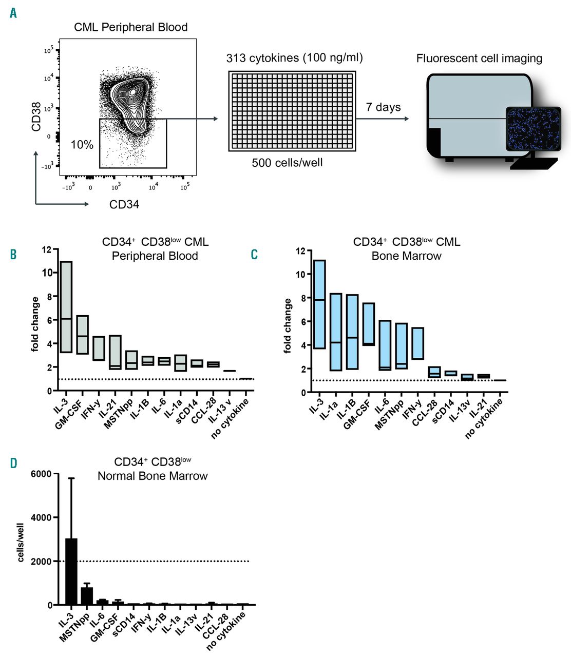 To identify positive regulators of primitive CML cells, we established a high-content cytokine screen using 313 unique human cytokines (Online Supplementary Table S2). CD34CD38 chronic phase CML PB samples with high leukemic burden (Online Supplementary Figure S1) were sorted into 384-well plates with one cytokine condition per well. After a 7-day culture, the number of live cells was enumerated with automized fluorescence microscopy (Figure 1A).