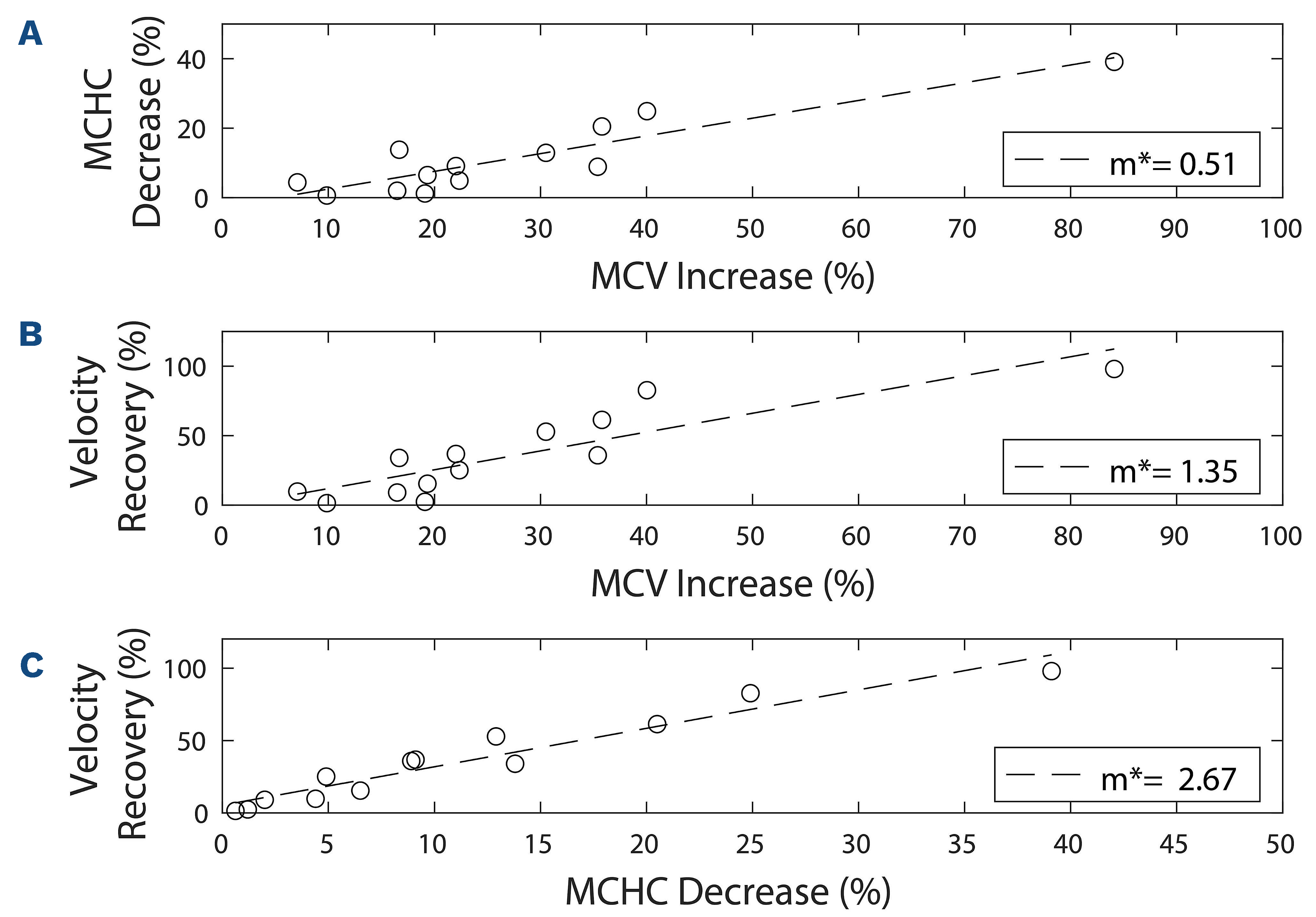 Figure 4.Linear correlation analysis. In order to determine which effect of monensin was driving sample velocity recovery, a correlation analysis to define the relationship between velocity recovery and monensin-induced mean corpuscular volume (MCV) or mean cell hemoglobin concentration (MCHC) change was completed. A Pearson correlation coefficient analysis was conducted to determine the strength of the linear relationship. (A) Change in MCV and change in MCHC was significantly positively correlated (r=0.91, P<0.001). (B) Velocity recovery and MCV change also were positively significantly correlated (r=0.87, P<0.001). (C) The strongest correlation was found between velocity recovery and MCHC change (r=0.96, P<0.01).