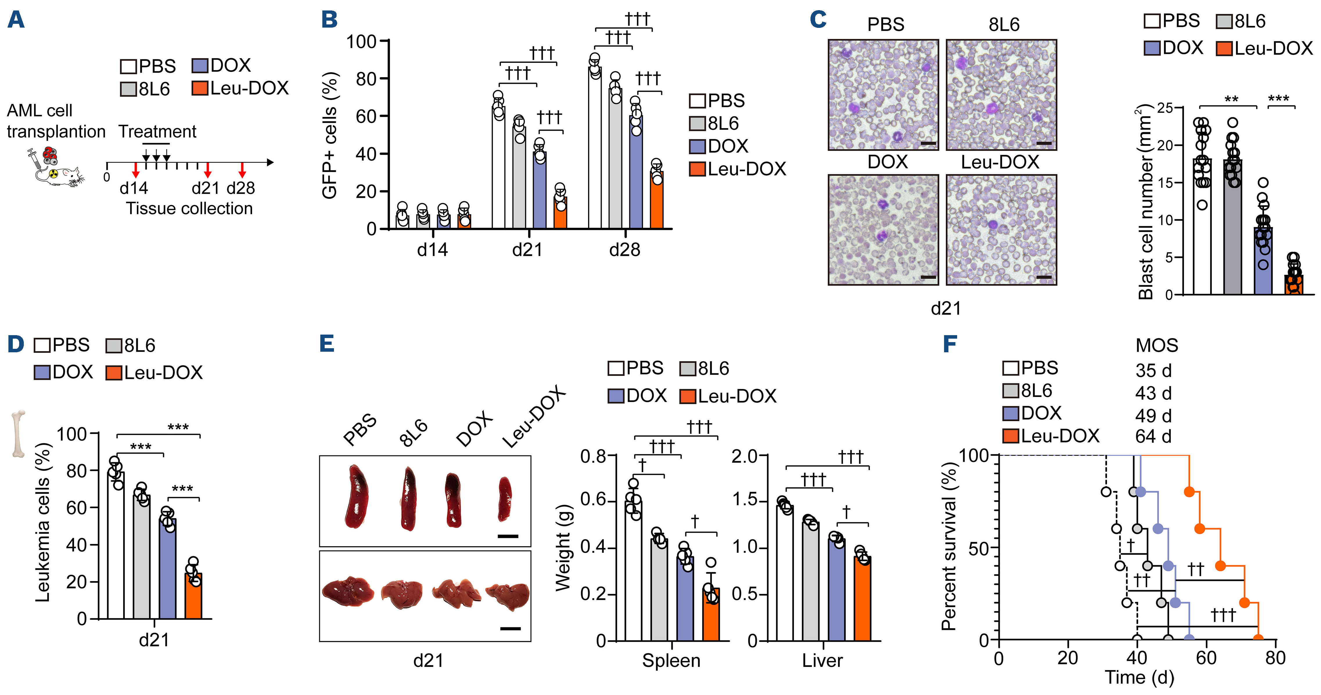 Figure 8.Leucine polymer-loaded doxorubicin enhances the chemotherapy efficacy in acute myeloid leukemia mice. (A) Schematic of acute myeloid leukemia (AML) mouse treatment. (B) The percentage of GFP+ leukemic cells in peripheral blood at the indicated time after treatment. (C) Representative peripheral blood smear (left) and quantification (right) of blast cells in the peripheral blood smear from AML mice at day 21 (d21) with indicated treatment (n=15 replicates from 5 mice). (D) The percentage of GFP+ leukemic cells in the bone marrow (BM) of AML mice at d21 with indicated treatment (n=5 mice). (E) Images (left) and weight of spleen and liver (right) of AML mice at d21 with indicated treatment (n=5 mice) (scale bar=1 cm). (F) The survival curve of AML mice with indicated treatments (n=5 mice). MOS: median overall survival.