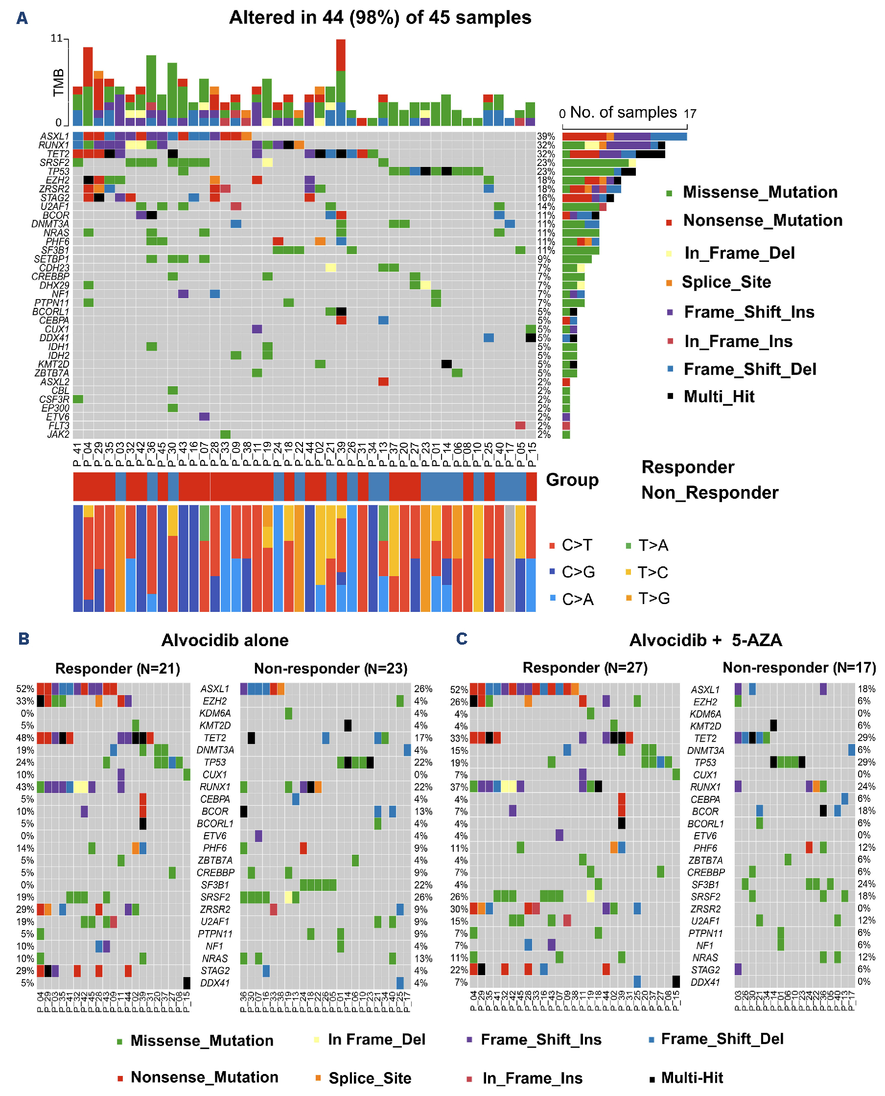 Figure 2.Mutational profiles in alvocidib and alvocidib + 5-AZA treated samples. (A) Bone marrow (BM) mononuclear cells (MNC) of myelodysplastic syndromes (MDS) patients (N=40) were subjected to myeloid panel deep sequencing. The mutational data for other N=5 MDS samples were obtained from the medical records. The mutations in MDS-associated genes were found in N=44 patients and presented as oncoplot. (B, C) MDS patients (N=44) were distributed into responder and non-responder groups based on the mean cell viability after alvocidib treatment (B) and alvocidib + 5-azacytidine (5-AZA) treatment (C) in CTG assay. Individual mutations for responders versus non-responders are presented as co-oncoplots. Del: deletion; Ins: insertion.