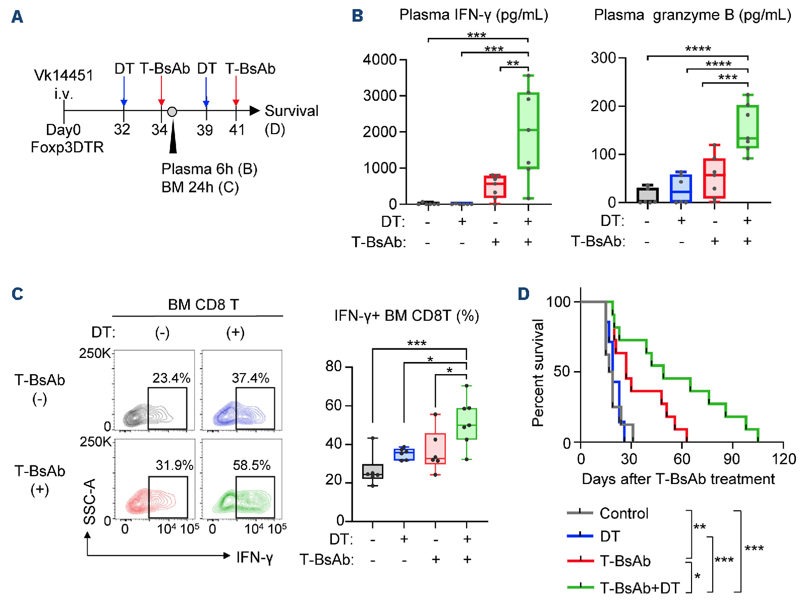 Figure 5.Transient ablation of regulatory T cells improves the efficacy of anti-B-cell maturation T-cell-engaging bispecific antibody therapy. (A) C57BL6 Foxp3DTR mice were challenged with Vk14451 multiple myeloma cells, and treated with diphtheria toxin in combination with anti-mouse B-cell maturation antigen T-cell-engaging bispecific antibodies (T-BsAb). The schematic illustrates the the experimental design. (B) Tumor-bearing mice were given the indicated treatment. Box and whisker plots showing levels of interferon-γ and granzyme B in plasma 6 h after treatment (N=6-7 per group). (C) Representative flow cytometry plots and box and whisker plots showing frequencies of interferon-γ+ CD8 T cells in the myeloma bone marrow 24 h after treatment (N=6-7 per group). (D) Kaplan-Meier survival curves of mice after the indicated treatment (N=7-11 per group). Data are pooled from two independent experiments. Differences were tested for statistical significance using two-way analysis of variance with a post-hoc Tukey multiple comparisons test (B, C) and a Mantel-Cox test (D). *P<0.05, **P<0.01, ***P<0.001, ****P<0.0001. DTR: diphtheria toxin receptor; DT: diphtheria toxin; T-BsAb: T-cell-engaging bispecific antibody; BM: bone marrow; IFN: interferon.