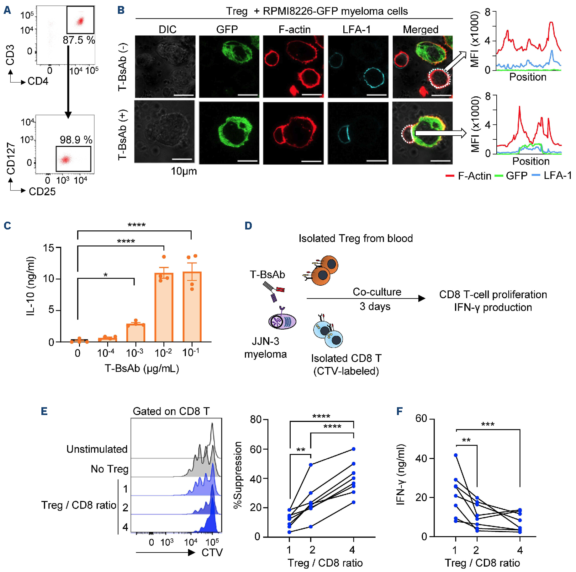 Figure 4.T-cell-engaging bispecific antibody-activated regulatory T cells negatively regulate CD8 T-cell responses. (A) Representative flow cytometry plots showing purity of CD25+CD127low regulatory cells (Treg cells) isolated from peripheral blood mononuclear cells. (B) Freshly isolated human Treg cells were co-cultured with RPMI8226 myeloma cells expressing green fluorescent protein in the presence or absence of anti-B-cell maturation antigen (BCMA) T-cell-engaging bispecific antibody (T-BsAb). Representative confocal images and graphs showing accumulation of LFA-1 and F-actin between Treg cells and multiple myeloma cells after stimulation by anti-BCMA T-BsAb (scale bar: 10 µm). Images were processed using MetaMorph software. Representative results from two experiments are shown. (C) CD25+CD127low Treg cells (2×105) were co-cultured with JJN-3 myeloma cells (1×105) with indicated concentrations of anti-BCMA T-BsAb for 3 days. The graphs show levels of interleukin-10 in culture supernatants. Data are shown as mean ± standard error of mean (N=4). (D) CD4+CD25+CD127low Treg cells and CD8 T cells were co-cultured with JJN-3 myeloma cells at different Treg/CD8 ratios in the presence of anti-BCMA T-BsAb for 3 days. The schematic illustrates the experimental design. (E, F) Representative histograms showing CD8 T-cell proliferation at indicated Treg/CD8 ratios (E, left). Individual graphs showing the suppressive effect of Treg cells on CD8 T-cell proliferation (E, right). Individual graphs showing interferon-g production at different Treg/CD8 ratios (F). Pooled results from three experiments are shown (N=8). Differences were tested for statistical significance using a repeated measures analysis of variance with a post-hoc Dunnet multiple comparisons test (C) and Tukey multiple comparisons test (E, F). *P<0.05, **P<0.01, ***P<0.001, ****P<0.0001. DIC: differential interference contrast; GFP: green fluorescent protein; LFA-1: lymphocyte function-associated antigen 1; MFI: mean fluorescent intensity; CTV: CellTrace™ Violet; IL: interleukin; IFN: interferon.